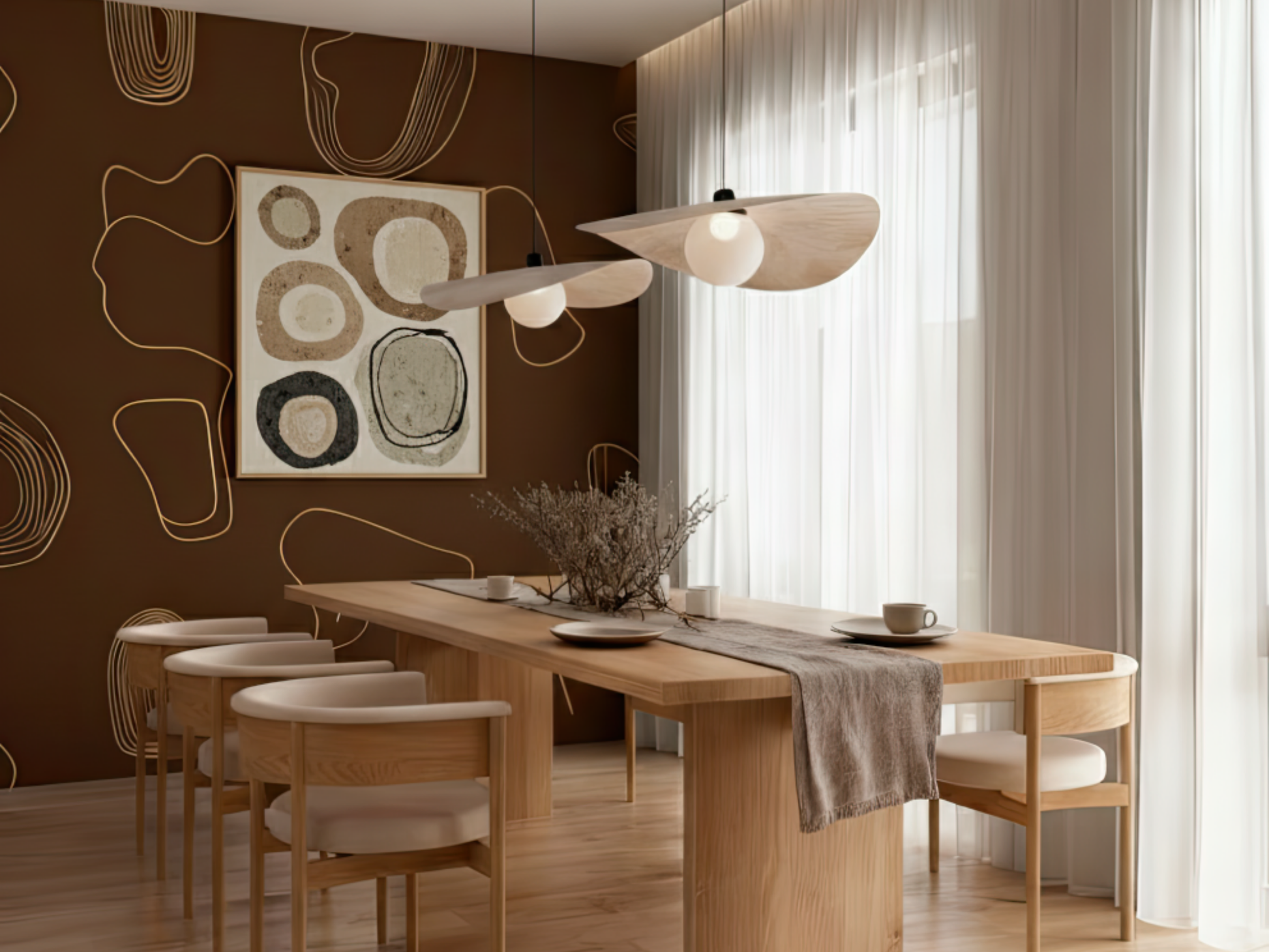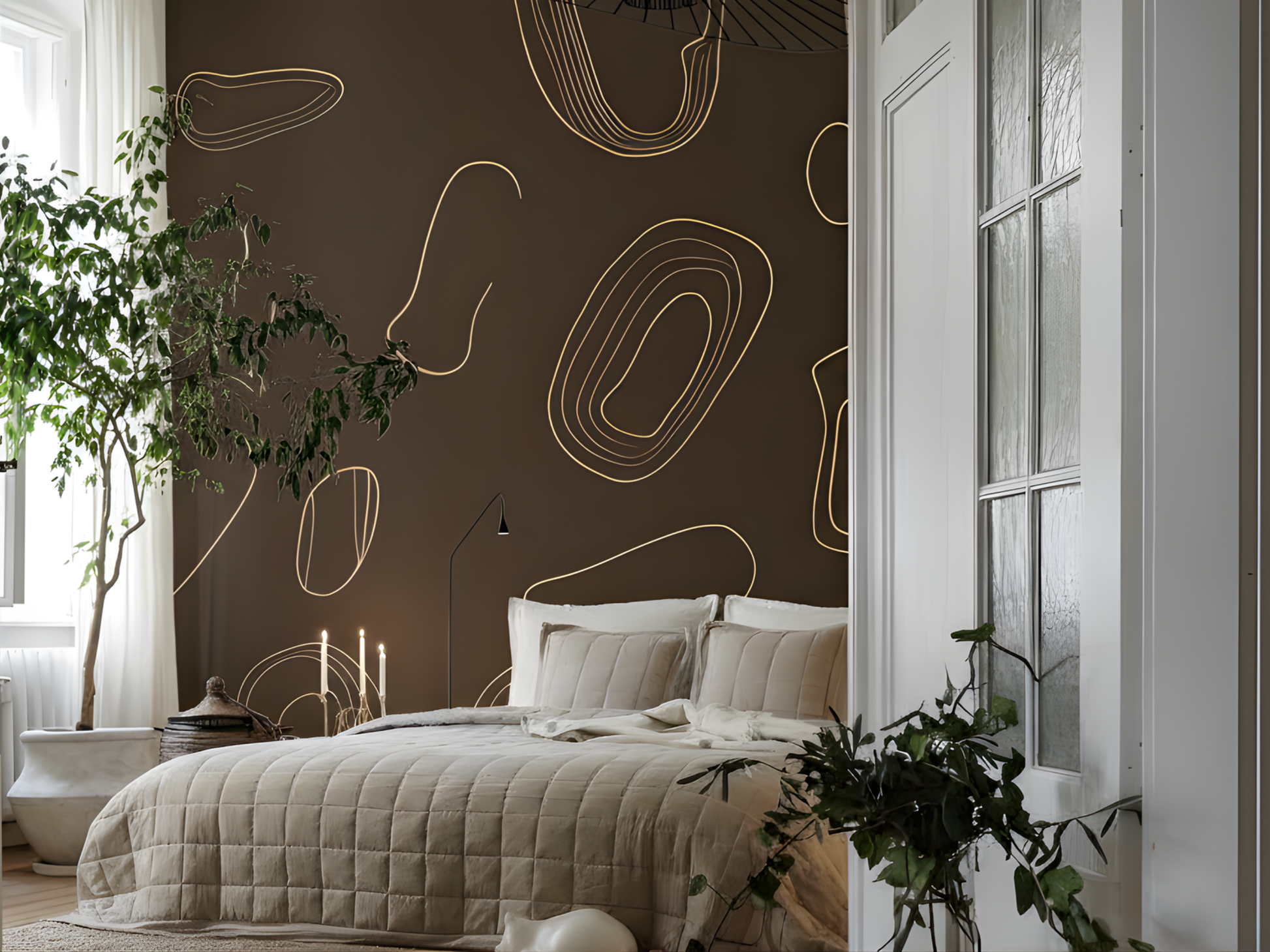 Inspired by the slow flow of molten earth and the organic curves of nature, this Japandi wallpaper pairs rich cocoa tones with meandering linework. A gentle rhythm that soothes the senses and softens the space. A space to unwind. A space to be.