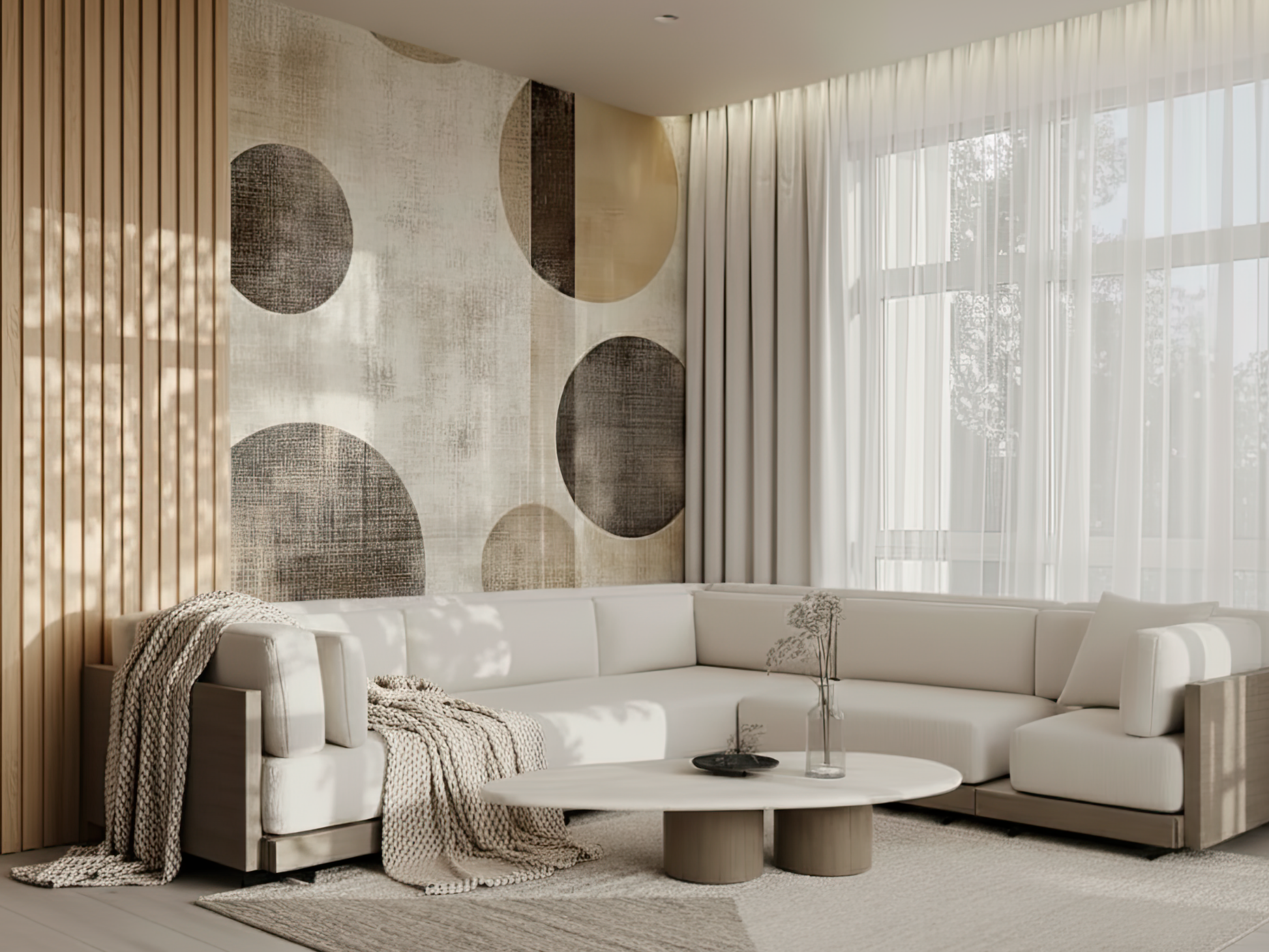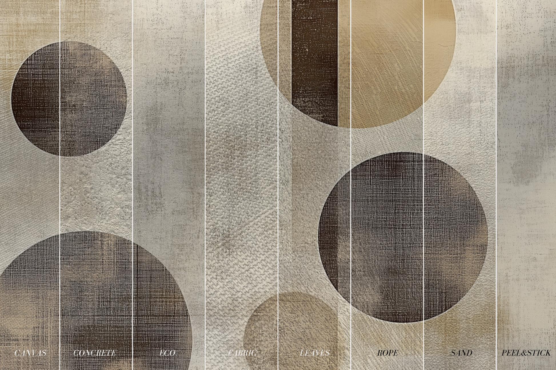 Inspired by the steady rhythm of time and the simplicity of circular harmony, this Japandi wallpaper layers soft geometry with worn textures and warm neutrals. A peaceful interplay of stillness and structure. A space to align. A space to be.
