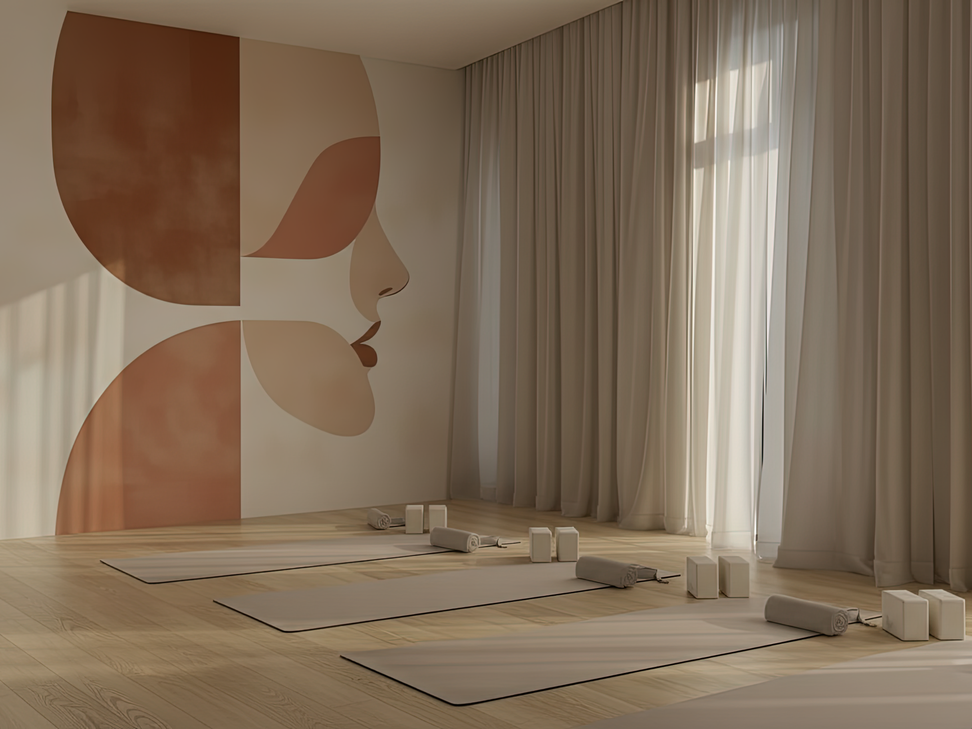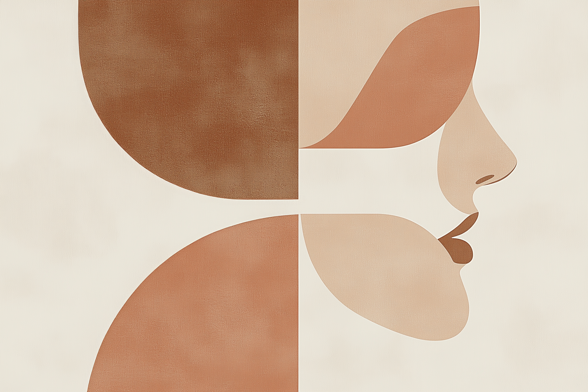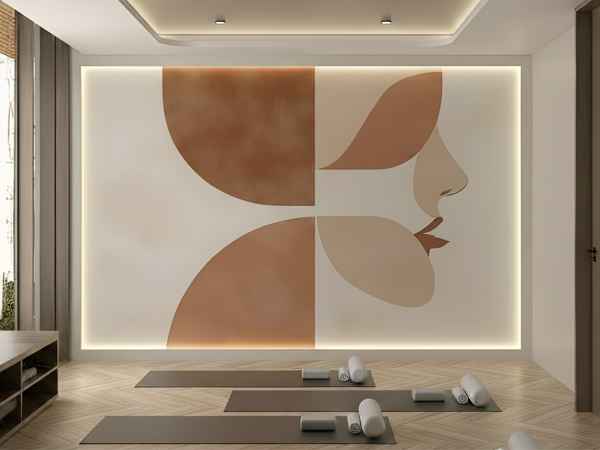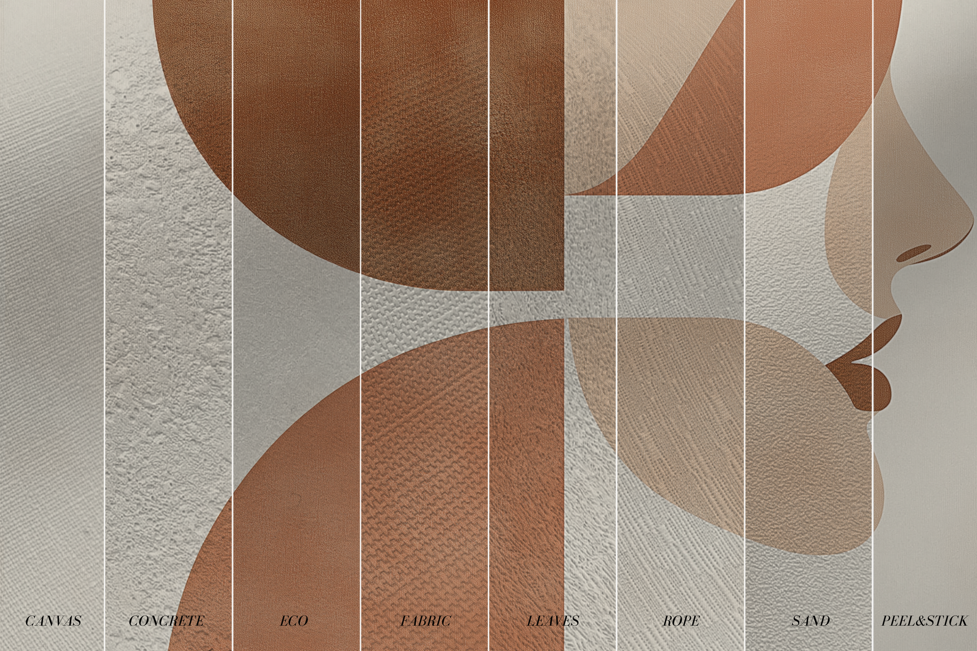Formed from sculptural arcs and gentle contours, this Japandi wallpaper captures the abstract grace of a human profile in harmony with nature. Terracotta, clay, and soft beige tones layer like earth and skin, evoking both warmth and stillness. It is a mural of balance where form dissolves into feeling, and silence blossoms into presence.
