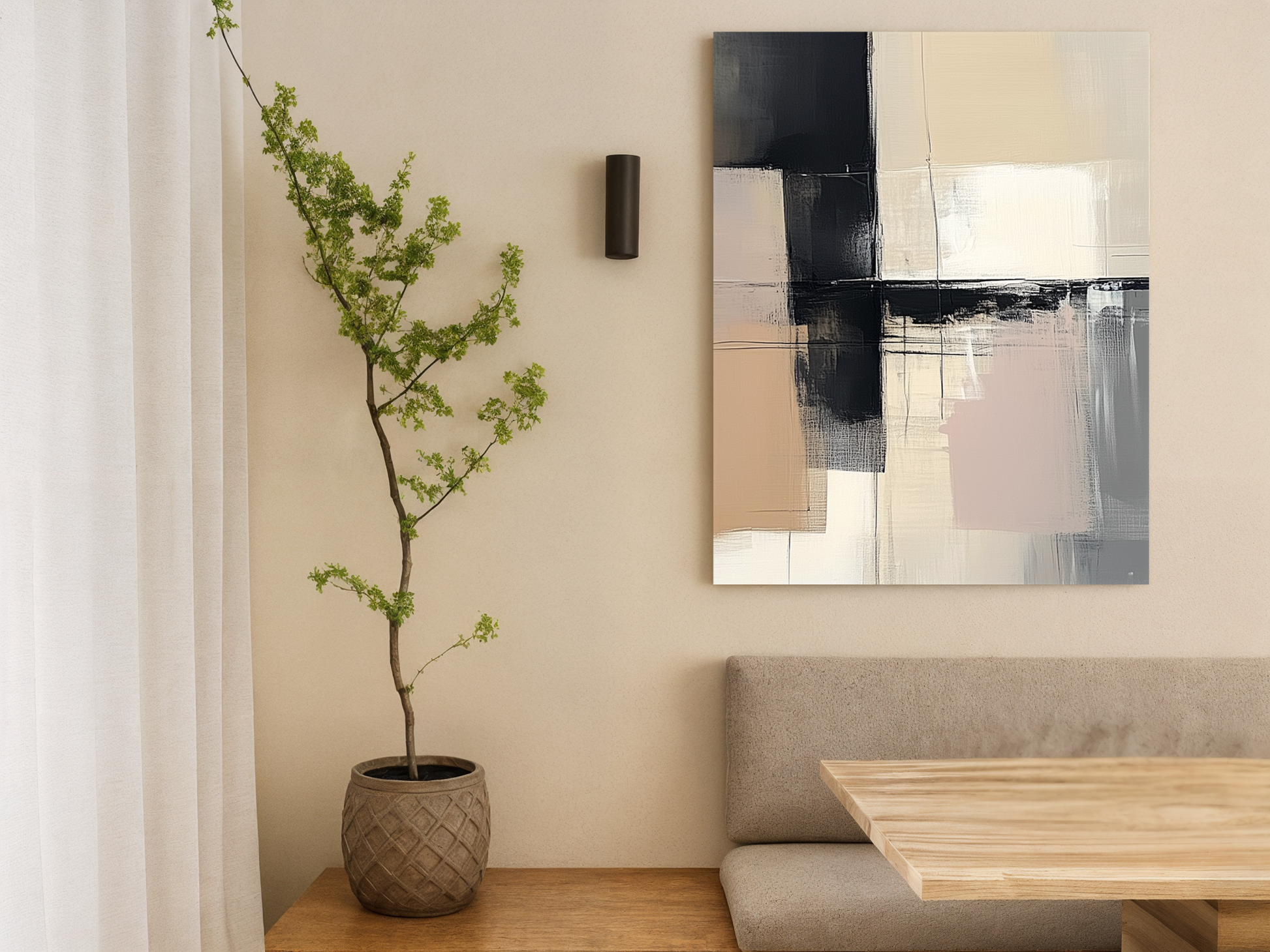 Abstract Balanceis a captivating piece of wooden wall art that harmonizes structure and fluidity. The design features intersecting grids and overlapping shapes, rendered in a soothing palette of muted tones including soft beige, gentle gray, and deep charcoal. These elements create a visual rhythm that balances order with a sense of organic movement.The abstract composition evokes a sense of calm and contemplation, making it an ideal addition to modern, minimalist, or Japandi-inspired interiors. The subtle textures of the wood grain add depth and warmth to the piece, enhancing its natural appeal while maintaining a refined, contemporary aesthetic.