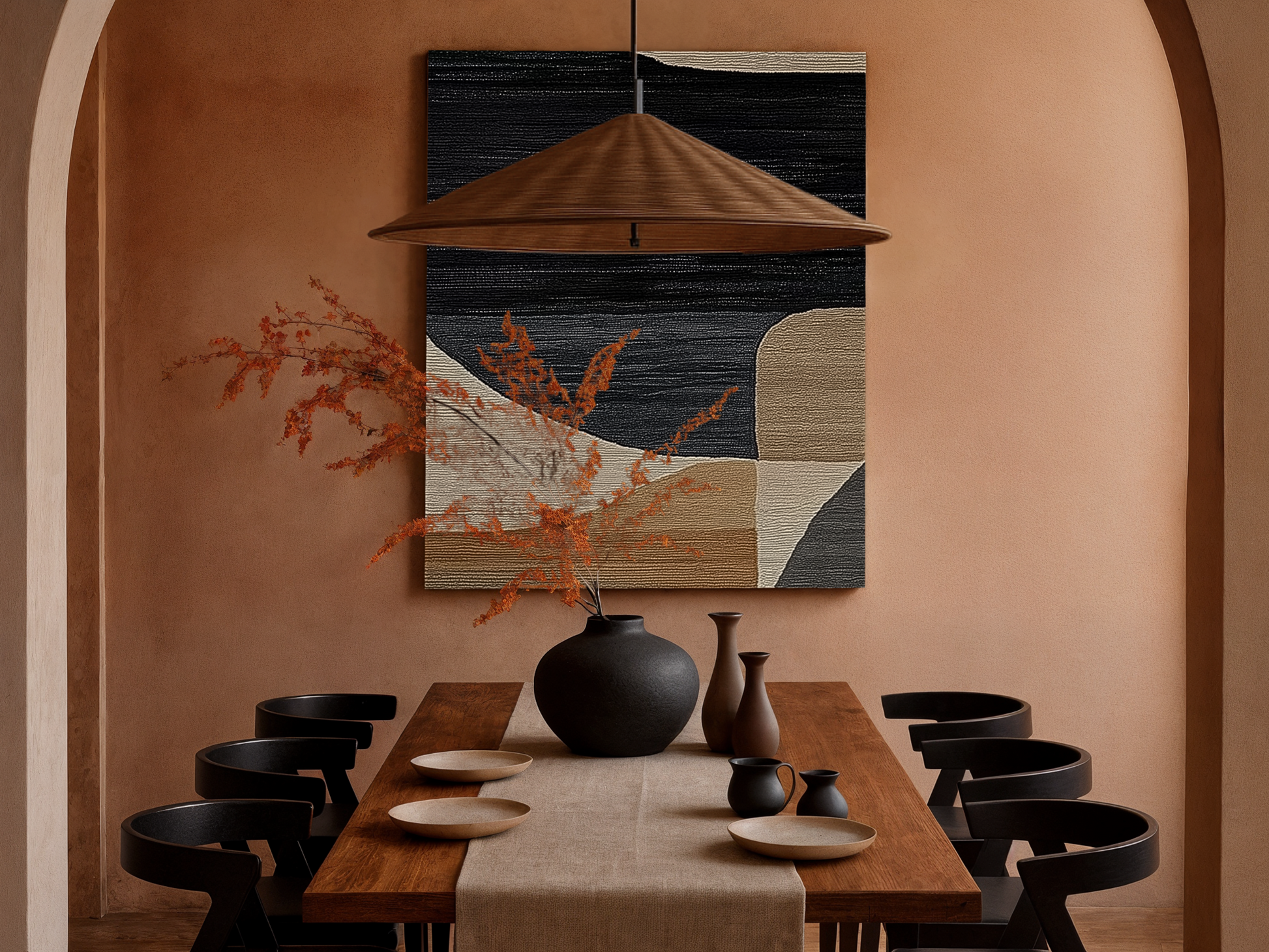 Desert Silhouettes is a captivating wooden wall art piece that brings to life the serene beauty of desert landscapes at dusk. The design features flowing, organic lines and a rich palette of earthy tones—deep blacks, warm browns, soft beiges, and muted grays—creating a composition that evokes the soft contours of dunes and hills as they fade into the darkening sky. The layering of these shapes suggests the quiet stillness of a desert evening, where the landscape is outlined in shadow and light. The natural grain of the birch wood subtly emerges through the colors, grounding the design in its organic origins and reinforcing its connection to the natural world.