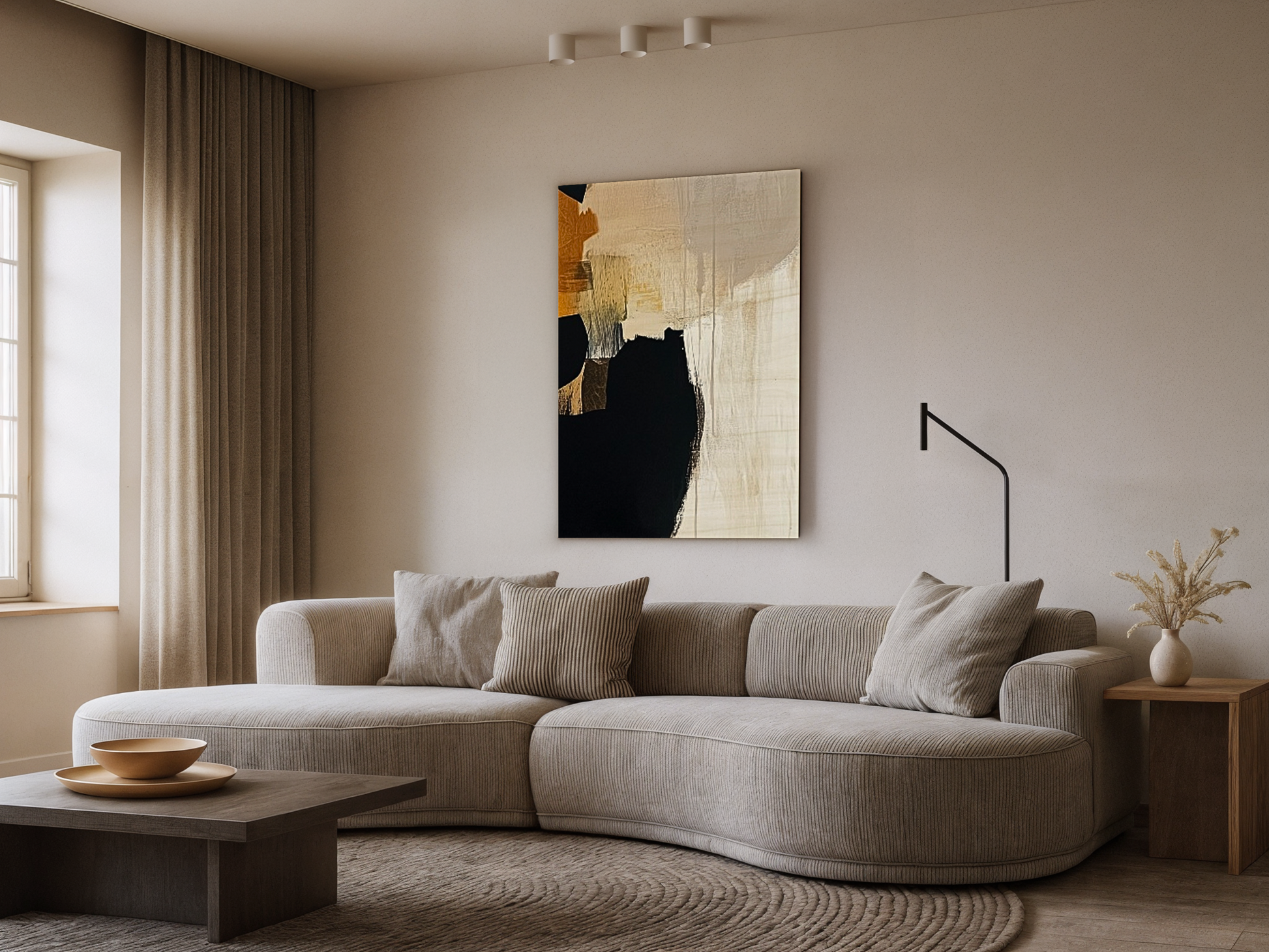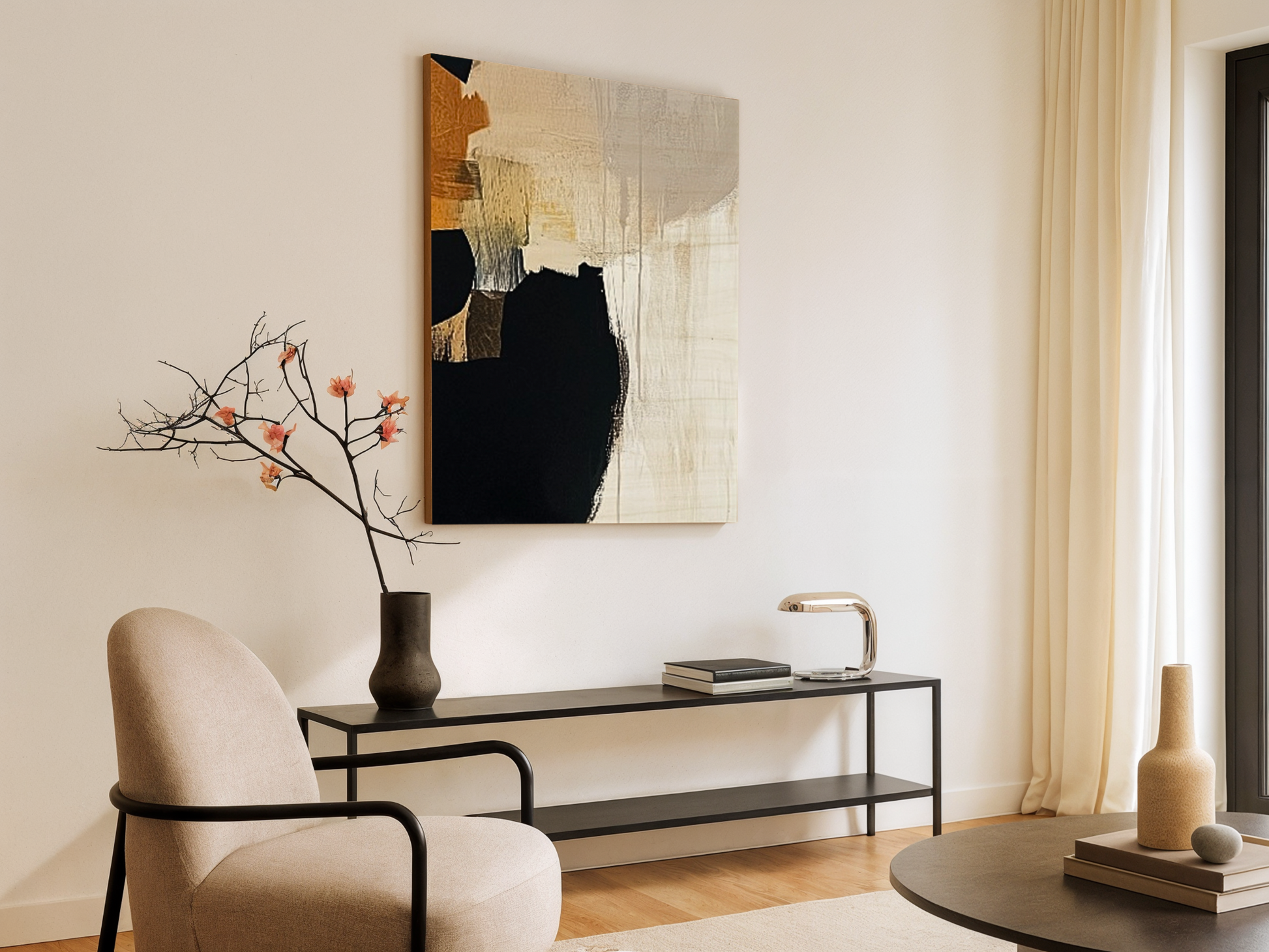 Eclipse of Shadows is a captivating piece of wooden wall art that explores the interplay of light and darkness through abstract forms. The design features bold, sweeping strokes of deep black, contrasted against a backdrop of warm earth tones and soft neutrals, evoking the sensation of an eclipse casting shadows over a serene landscape.The composition is anchored by the dominant black form that subtly overlaps the softer hues, creating a sense of depth and mystery. The textured surface of the birch wood adds an organic element to the artwork, allowing the natural grain to peek through and complement the abstract forms with a tactile quality.