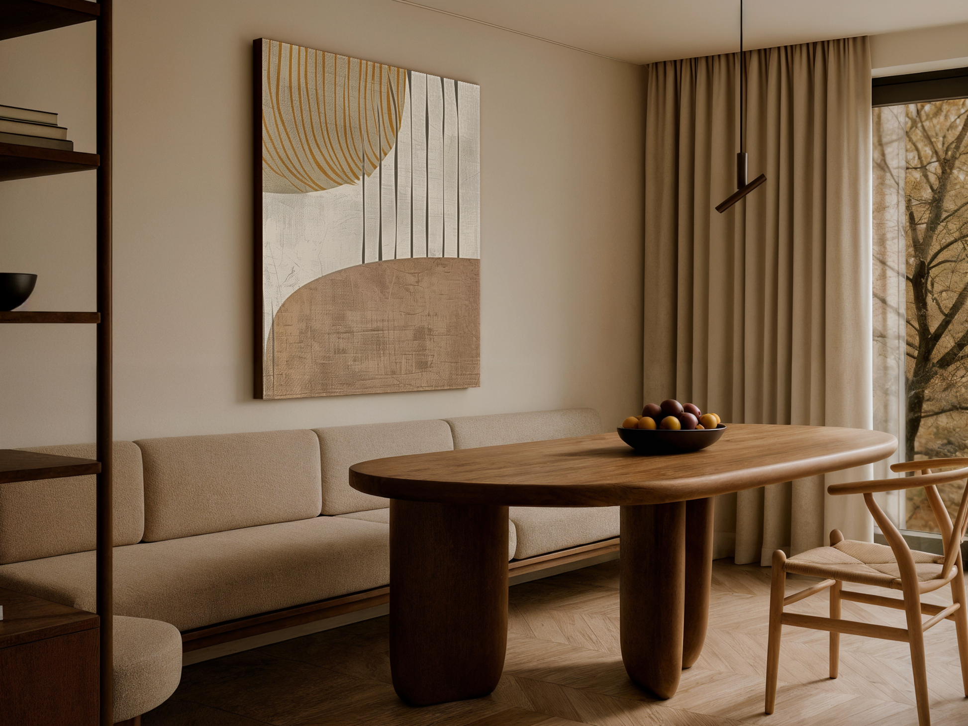 Harvest Flow is a captivating wooden wall art piece that embodies the essence of natural abundance and the gentle rhythms of the earth. The design features flowing, organic lines in warm, earthy tones of ochre, soft beige, and rich brown, evoking the imagery of golden fields swaying in the breeze during harvest time. The natural grain of the birch wood softly emerges through the warm tones, grounding the artwork in its organic roots and emphasizing its connection to the natural world.