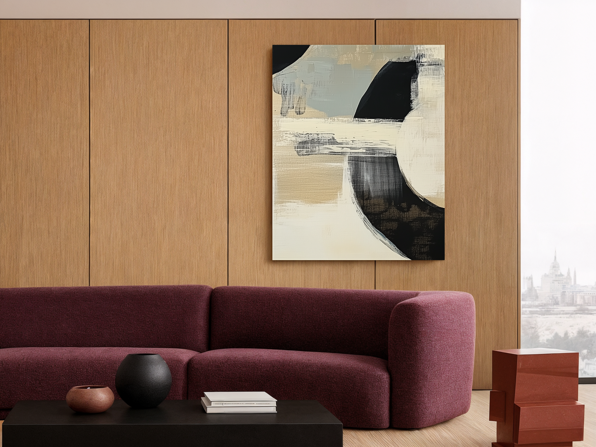 Intersecting Echoes is a dynamic piece of wooden wall art that explores the interplay of form, texture, and color. This design features bold, intersecting shapes that create a sense of movement and depth, while a muted palette of soft blues, warm ochres, and deep blacks grounds the composition in an earthy, natural aesthetic.The layered forms suggest echoes of organic shapes, while the strong horizontal and vertical lines add a modern, architectural feel. The subtle texture of the birch wood base enhances the design, allowing the natural grain to peek through and infuse the piece with a rustic charm.