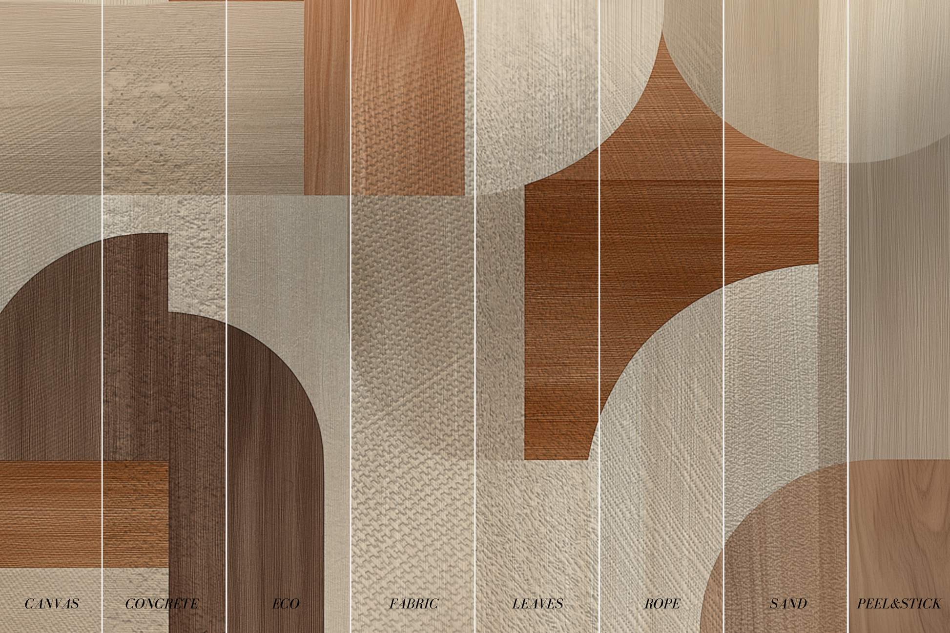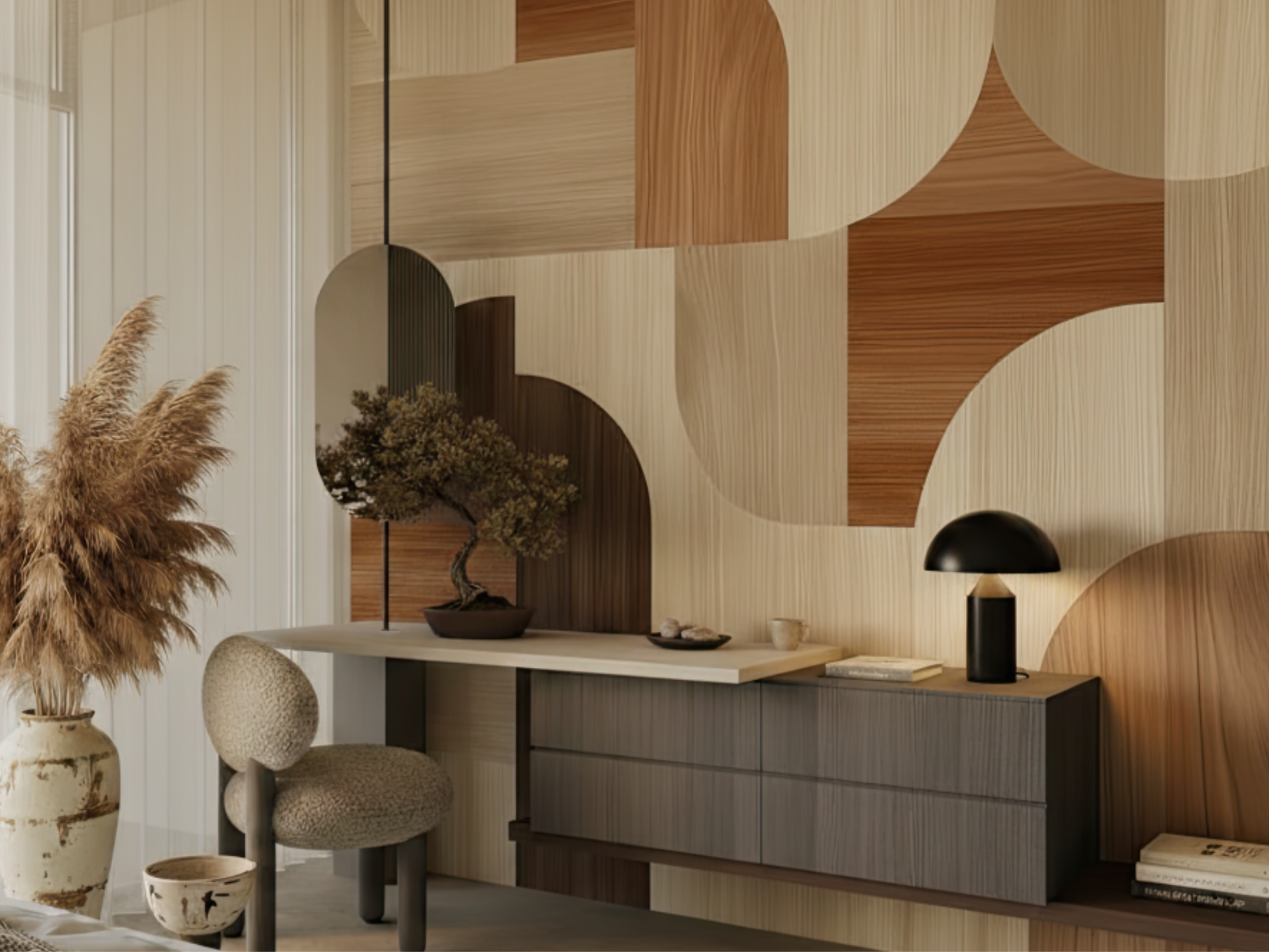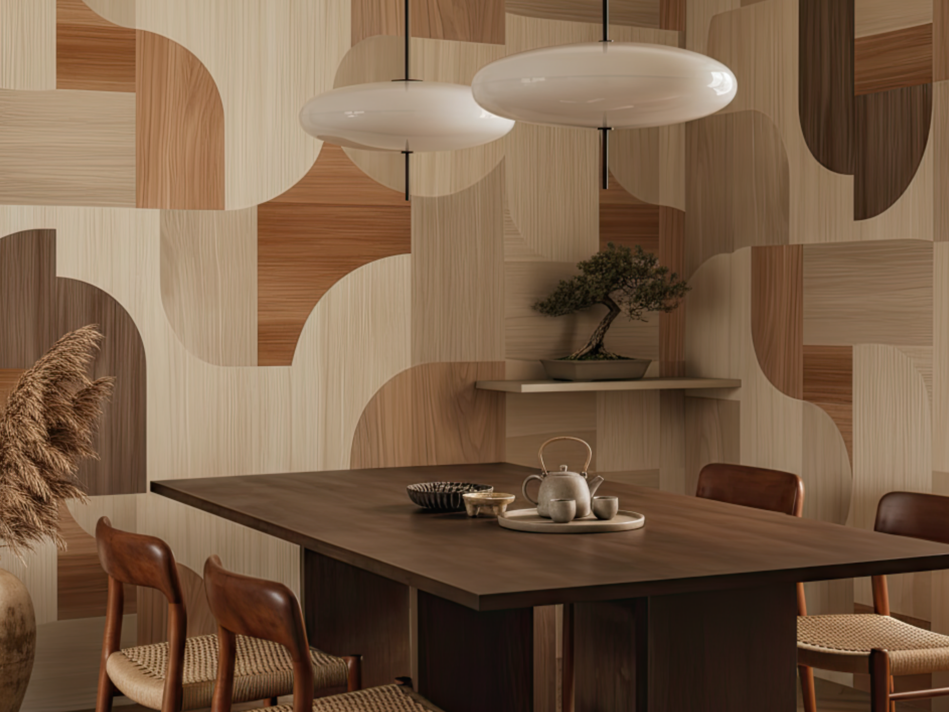 Inspired by the harmony of timber grains and the natural rhythm of curved forms, this Japandi wallpaper blends organic warmth with architectural balance. A space to breathe, a space to be.