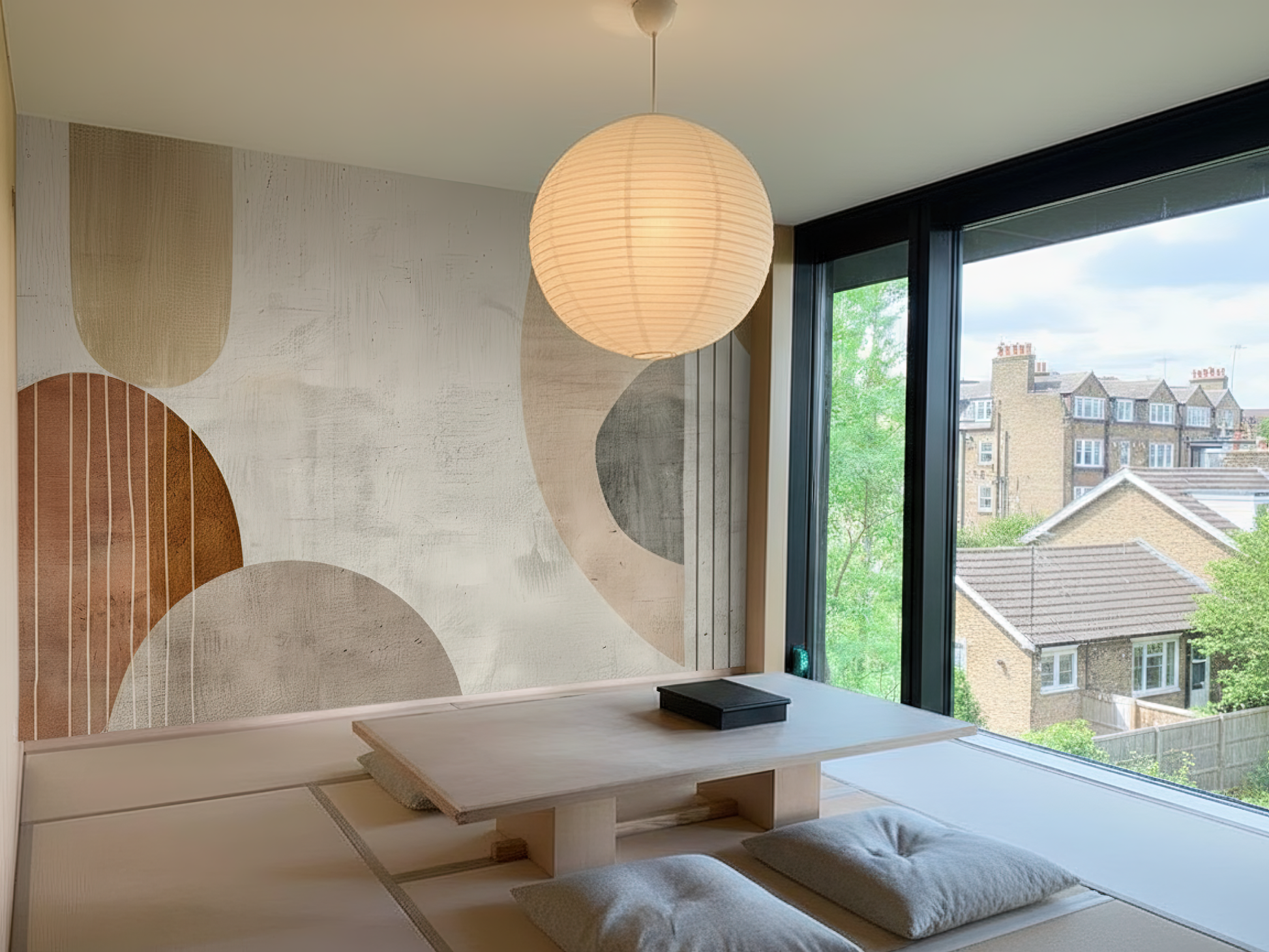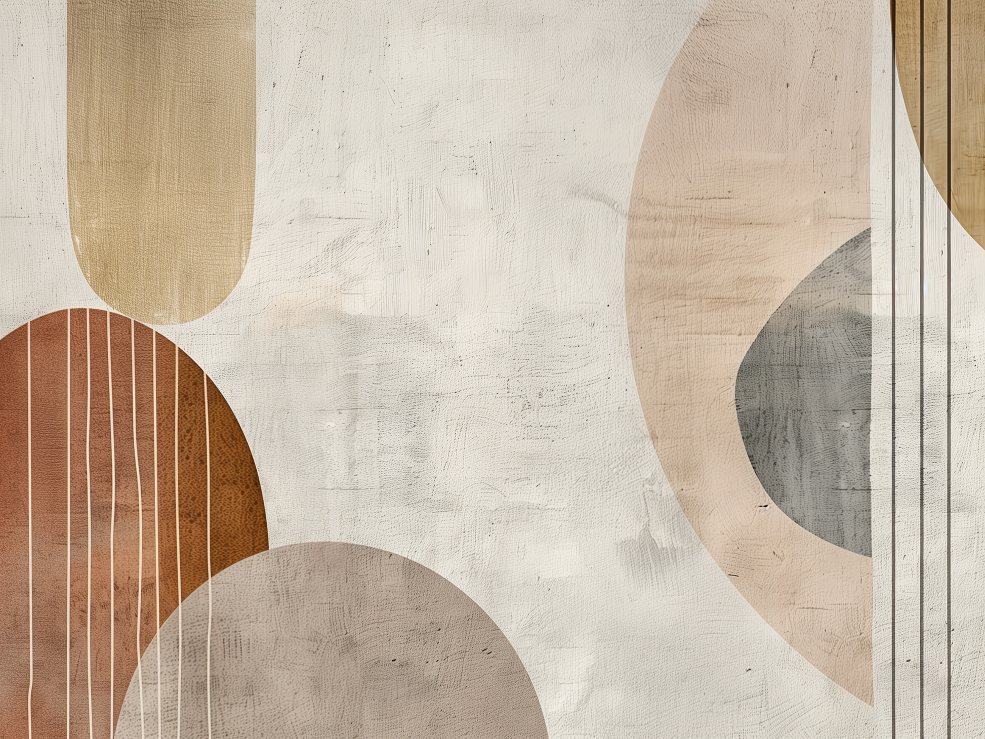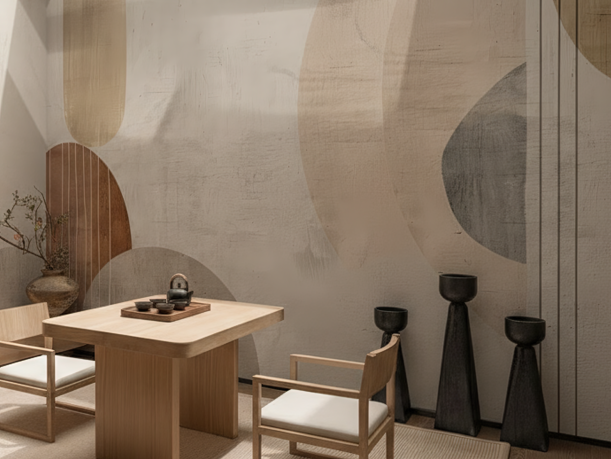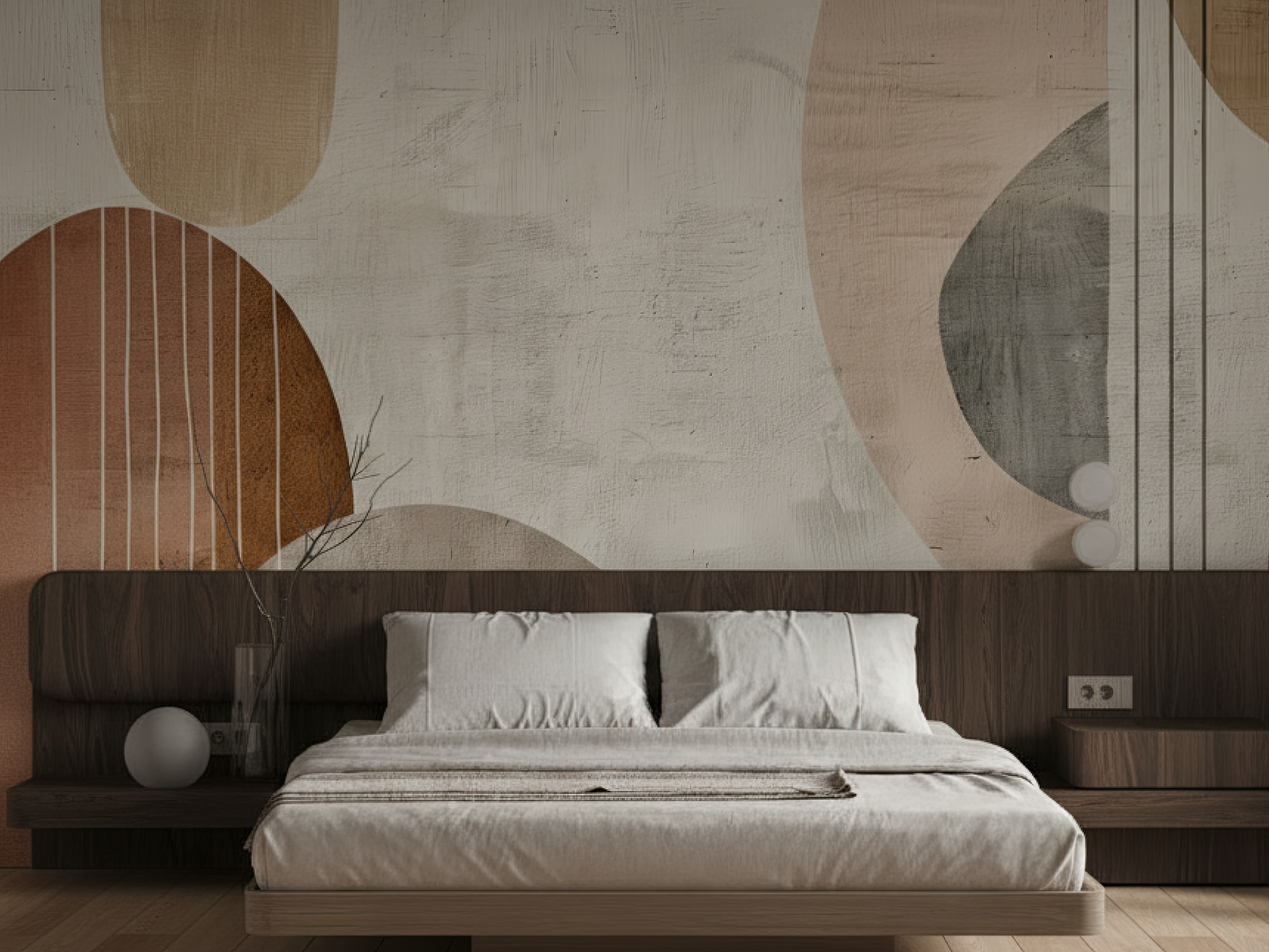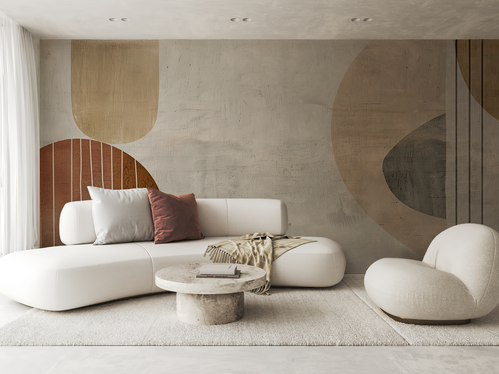 Inspired by warm morning light and gentle material contrasts, this Japandi wallpaper celebrates the interplay between balance and softness. Layered tones and curved forms echo moments of calm clarity—a design that feels grounded, yet quietly radiant. A space to breathe, a space to be.