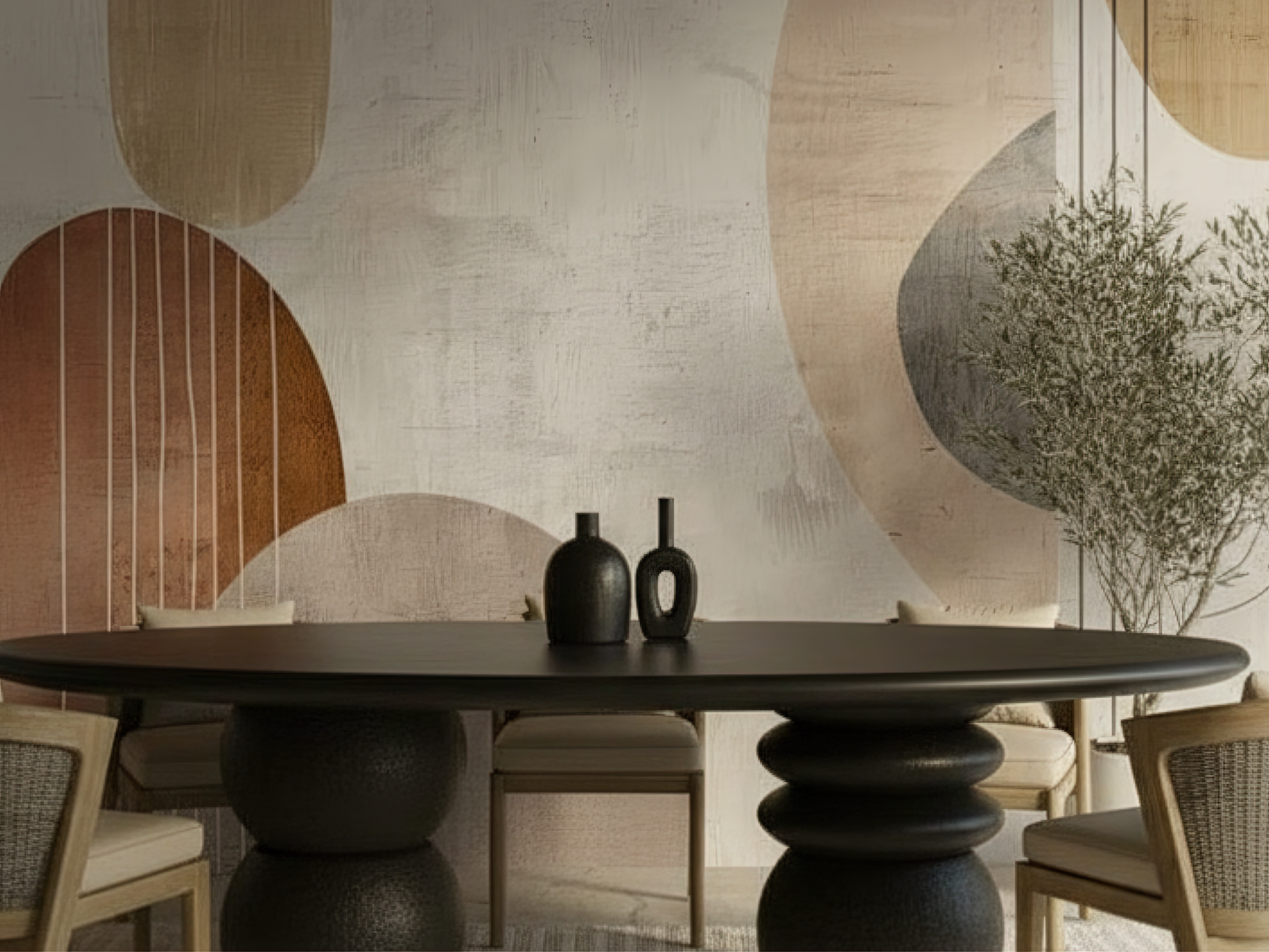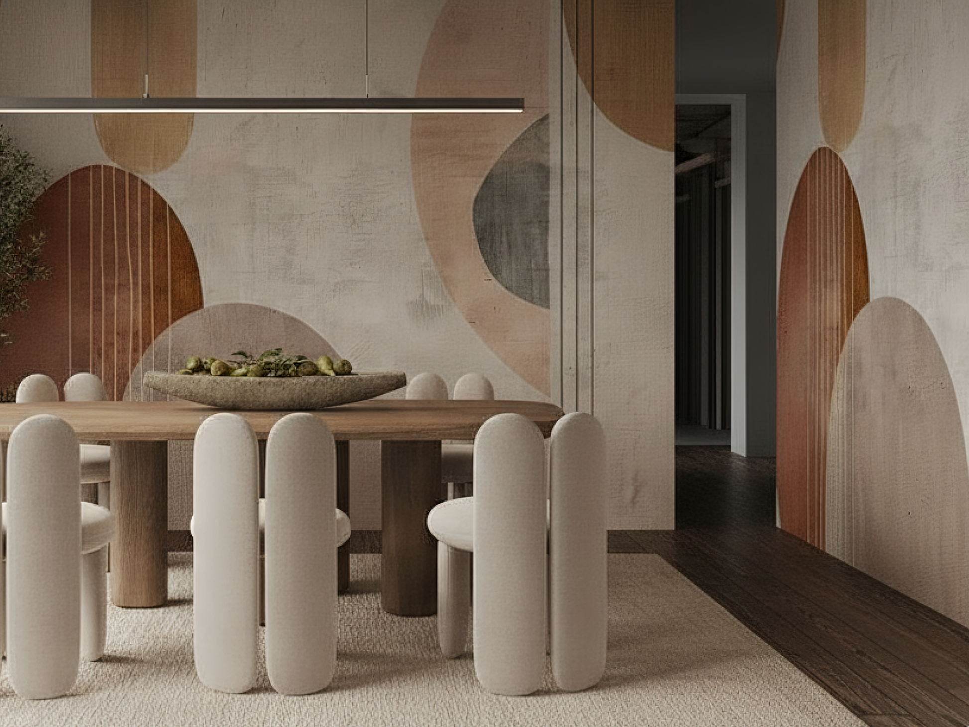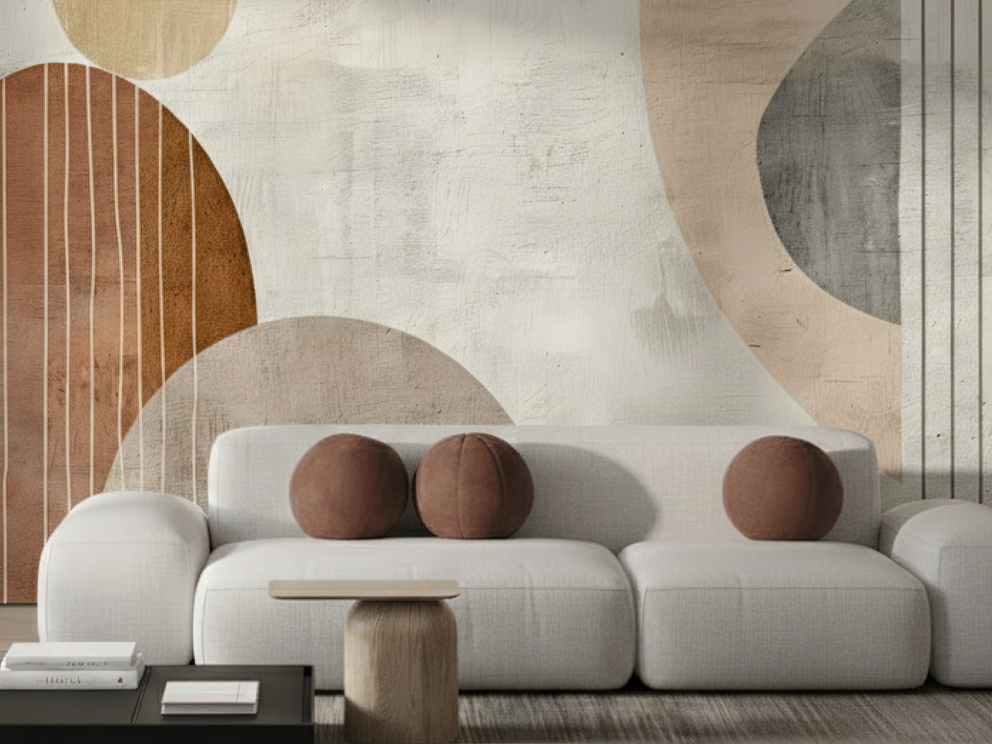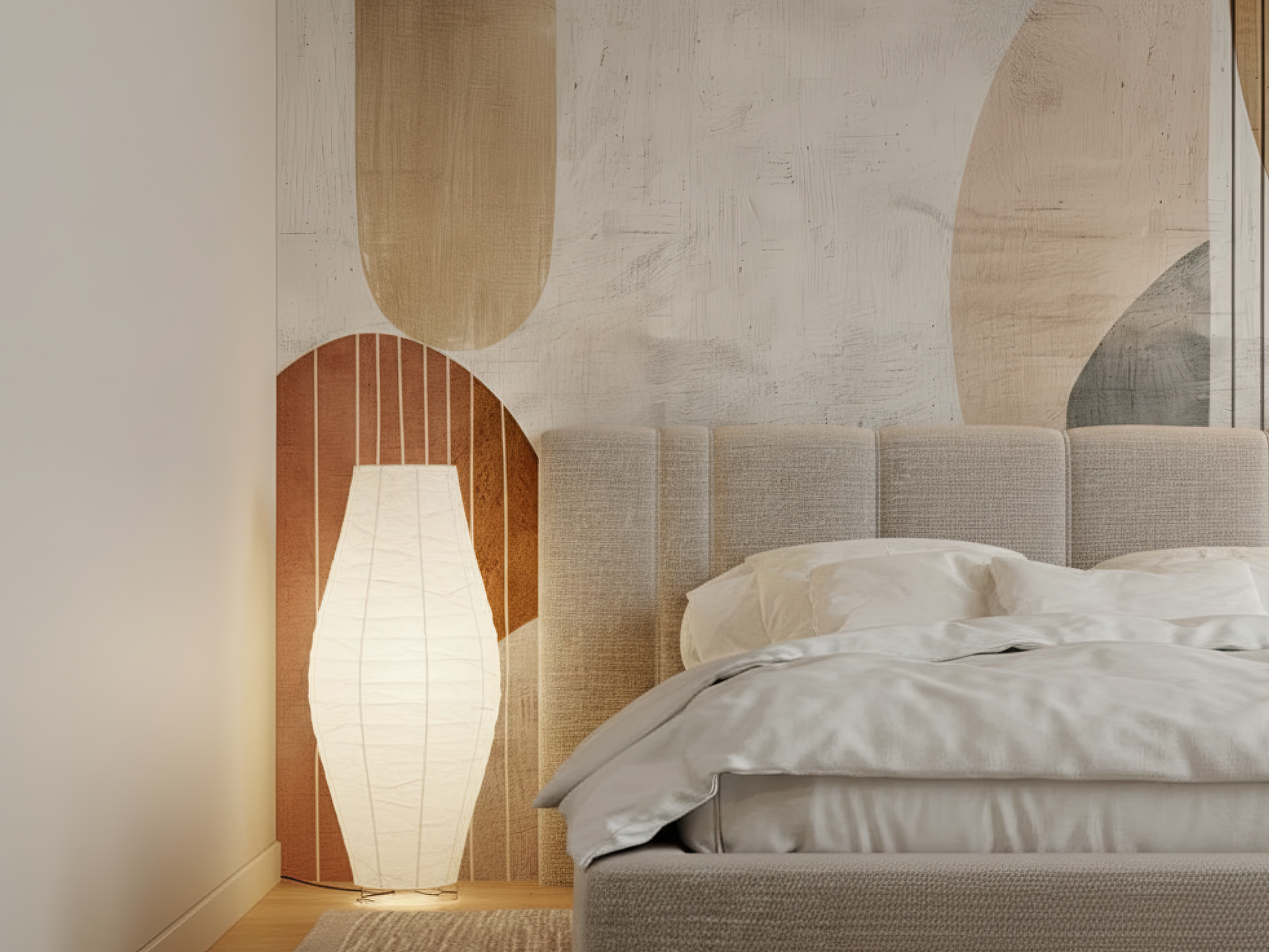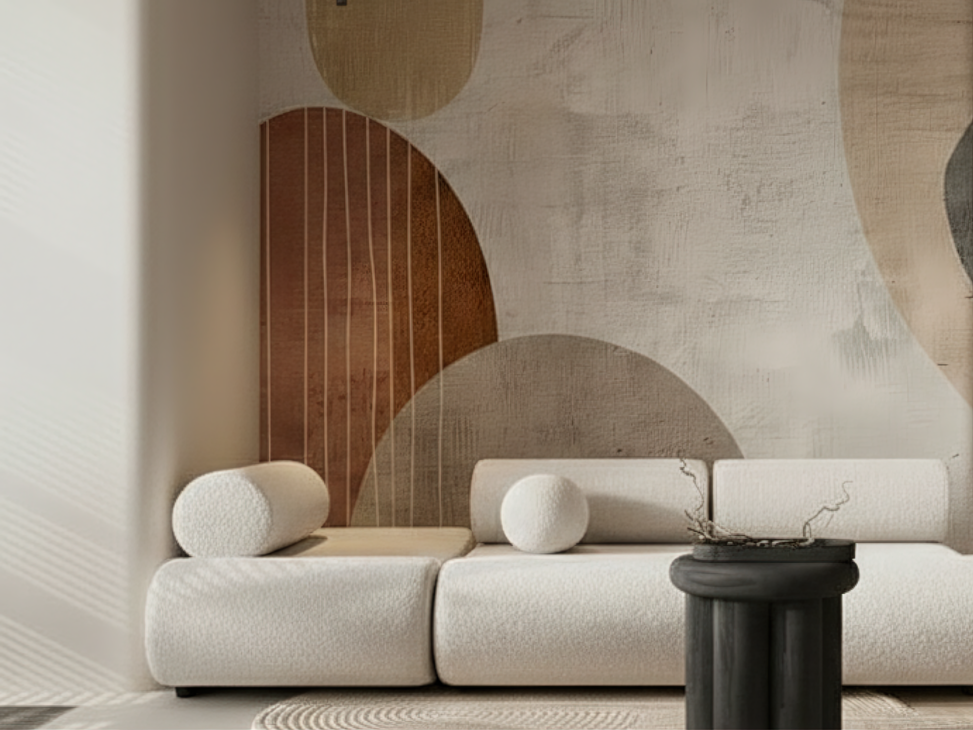 Inspired by warm morning light and gentle material contrasts, this Japandi wallpaper celebrates the interplay between balance and softness. Layered tones and curved forms echo moments of calm clarity—a design that feels grounded, yet quietly radiant. A space to breathe, a space to be.