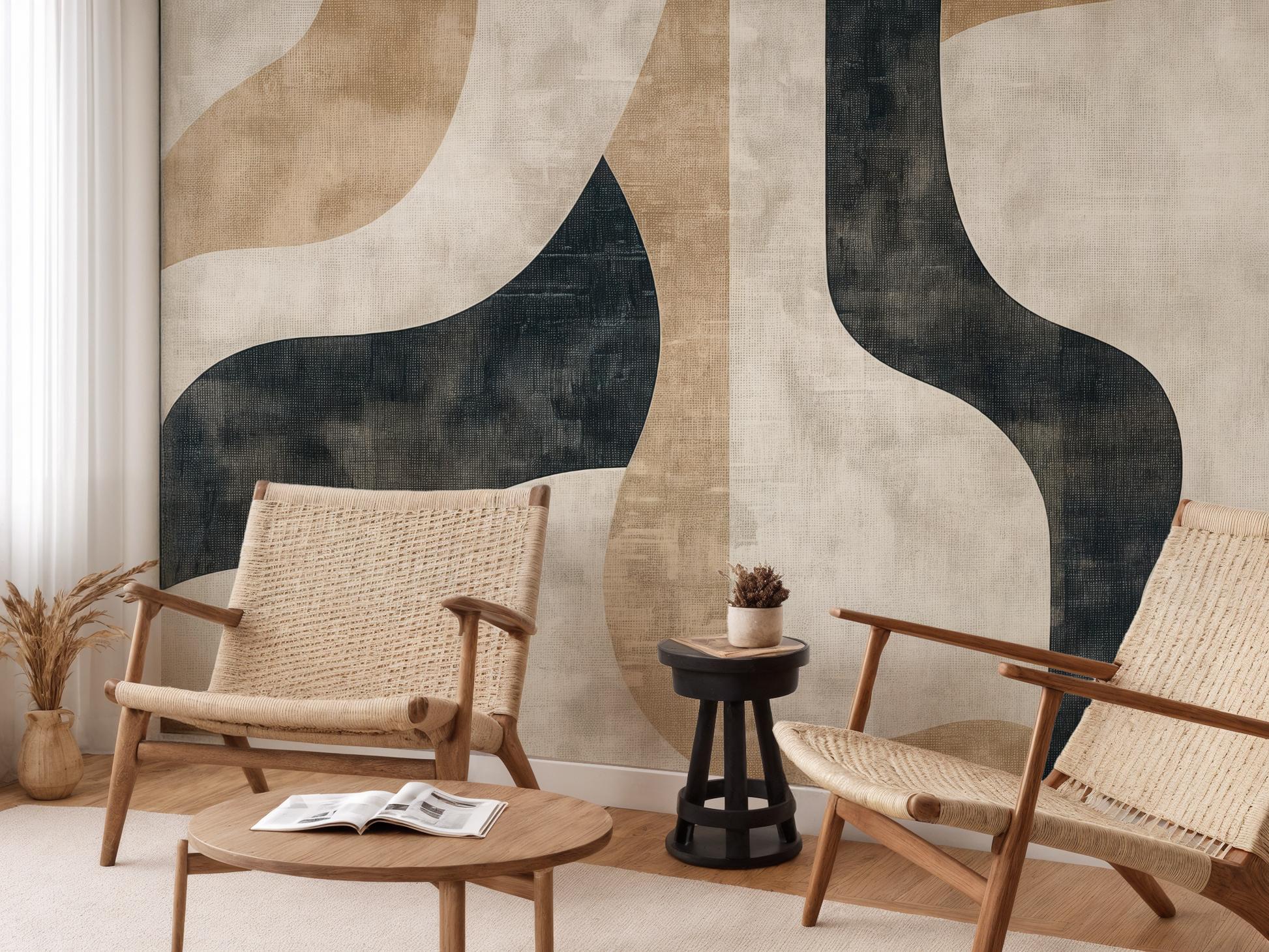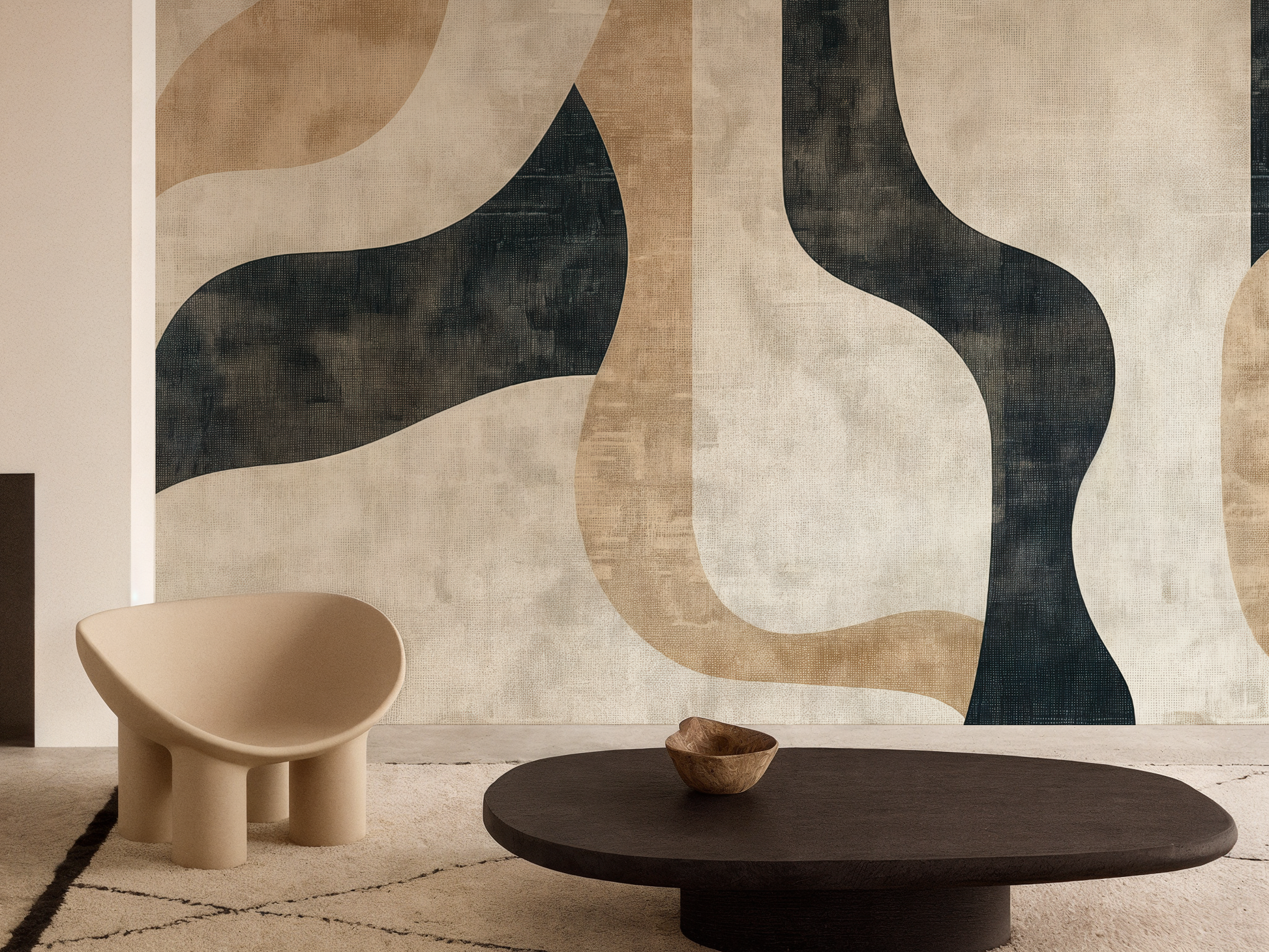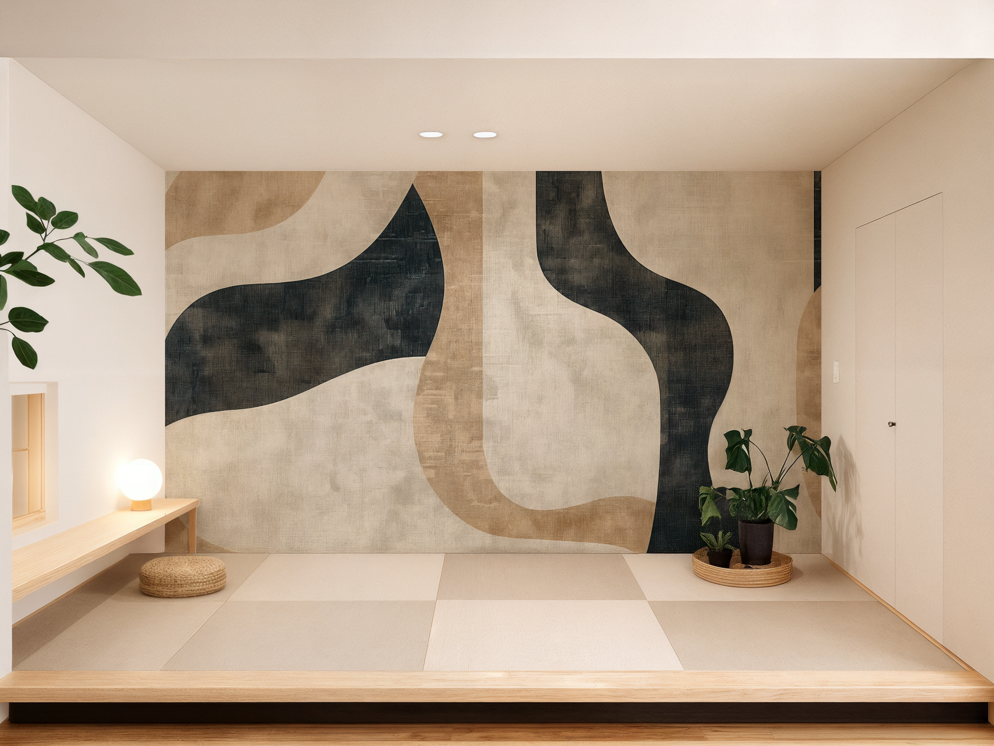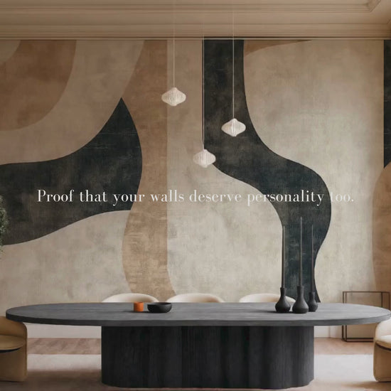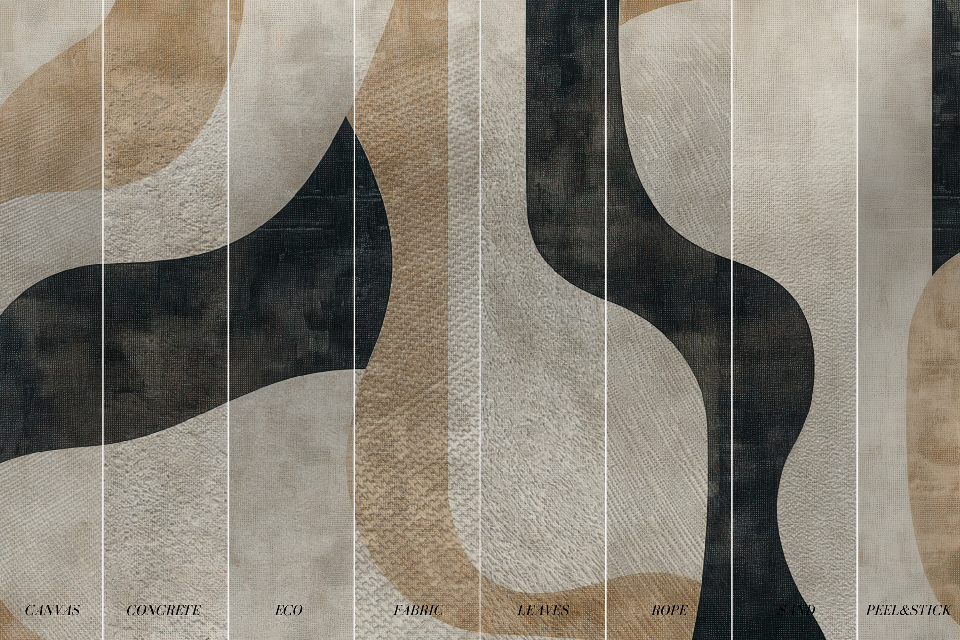 Inspired by the quiet journey of balance—between structure and softness, movement and pause—this Japandi wallpaper blends flowing forms with grounding shapes. A calm composition that invites mindful living. A space to follow. A space to be.