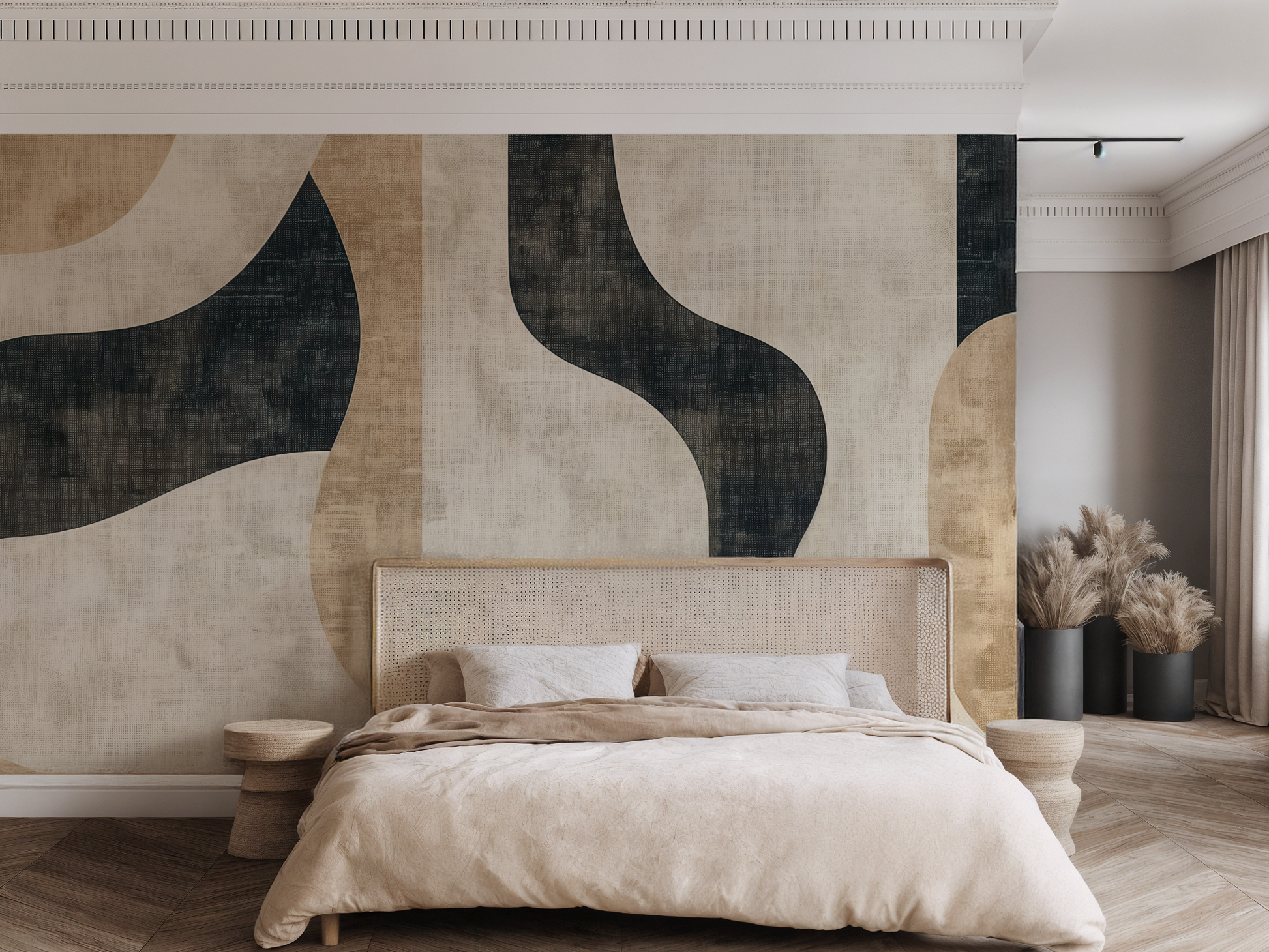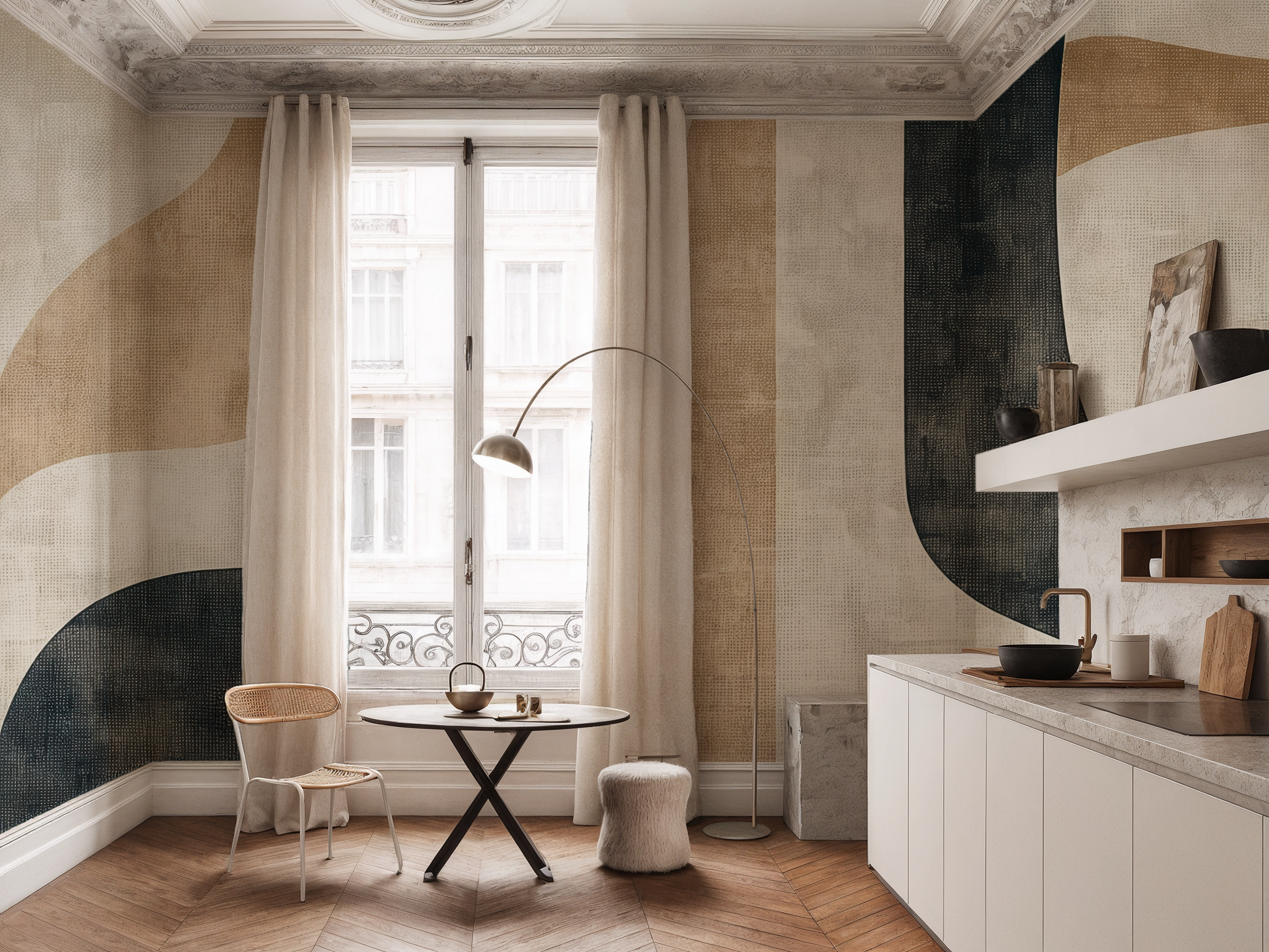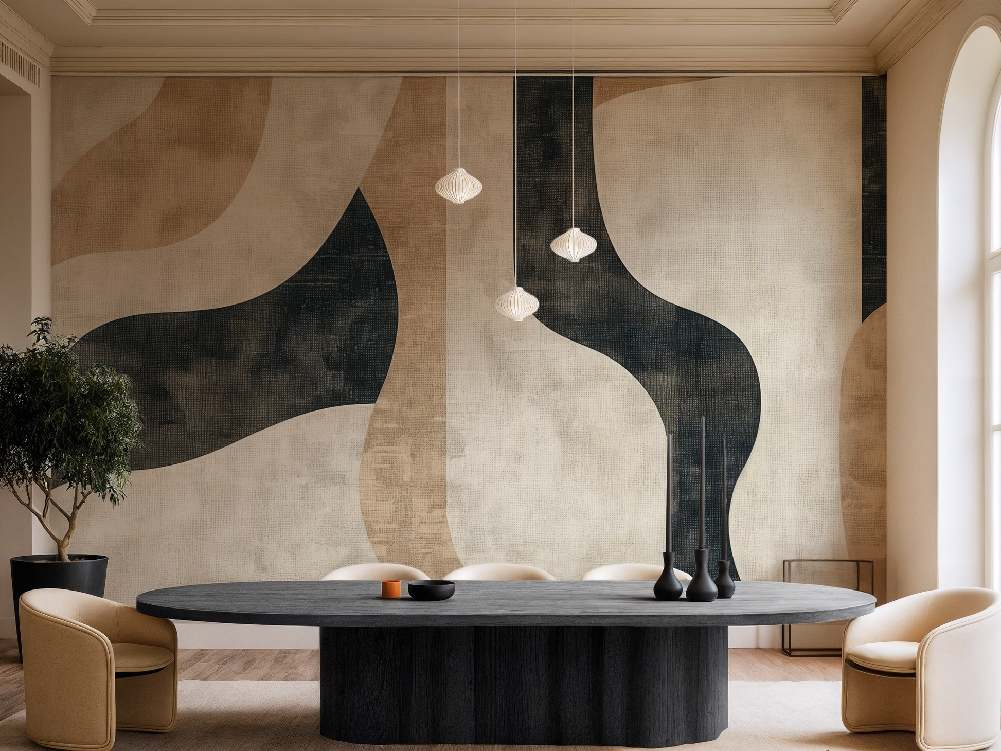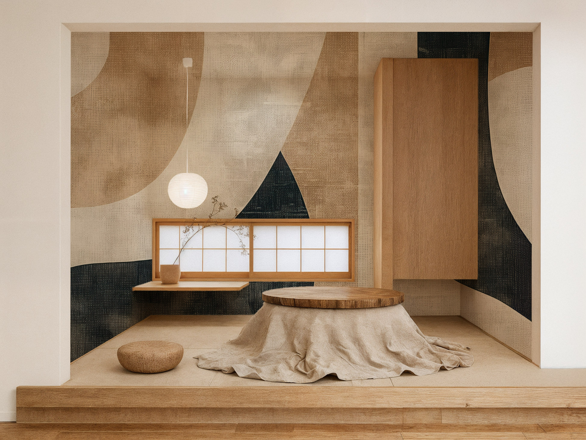 Inspired by the quiet journey of balance—between structure and softness, movement and pause—this Japandi wallpaper blends flowing forms with grounding shapes. A calm composition that invites mindful living. A space to follow. A space to be.