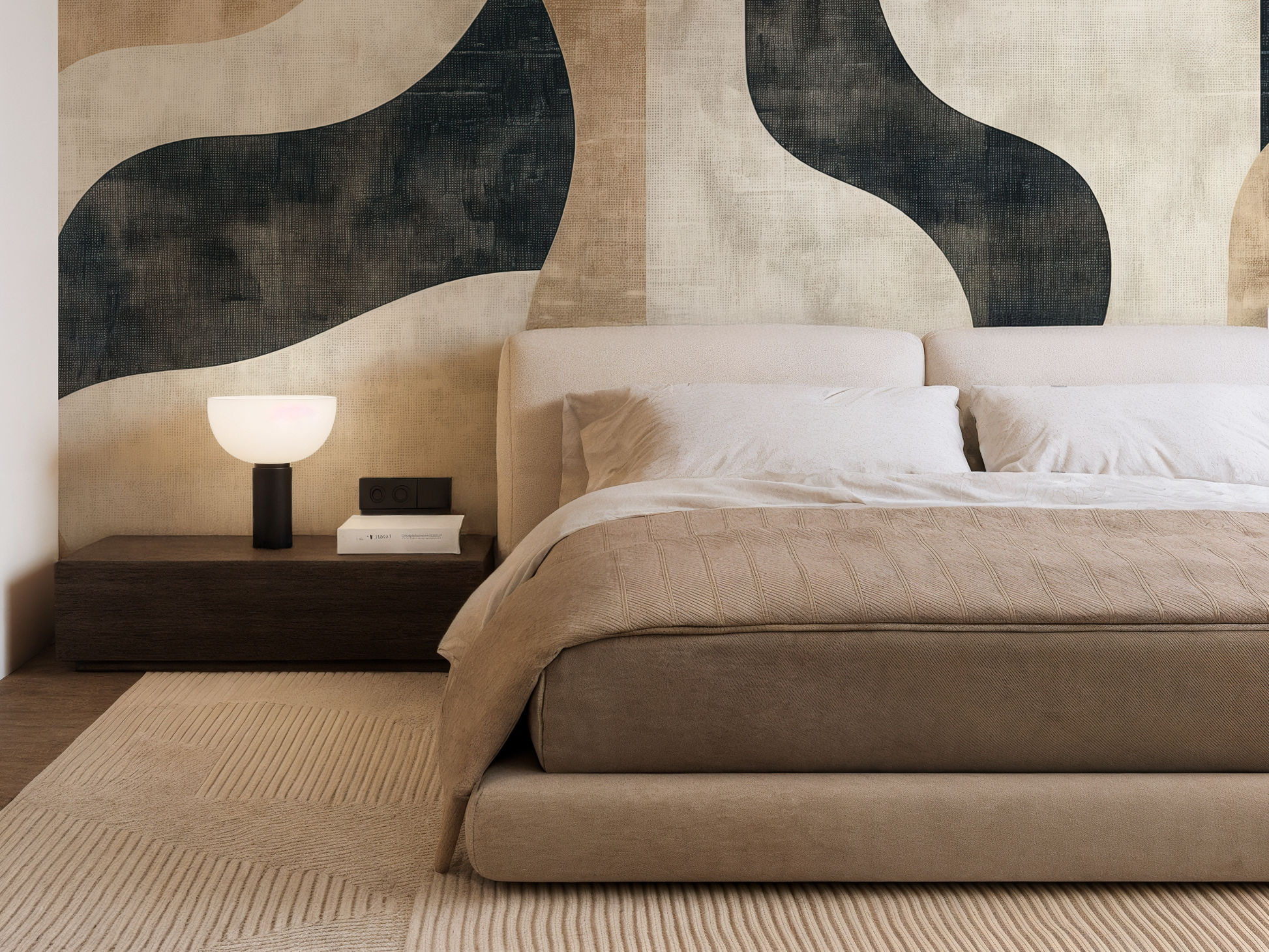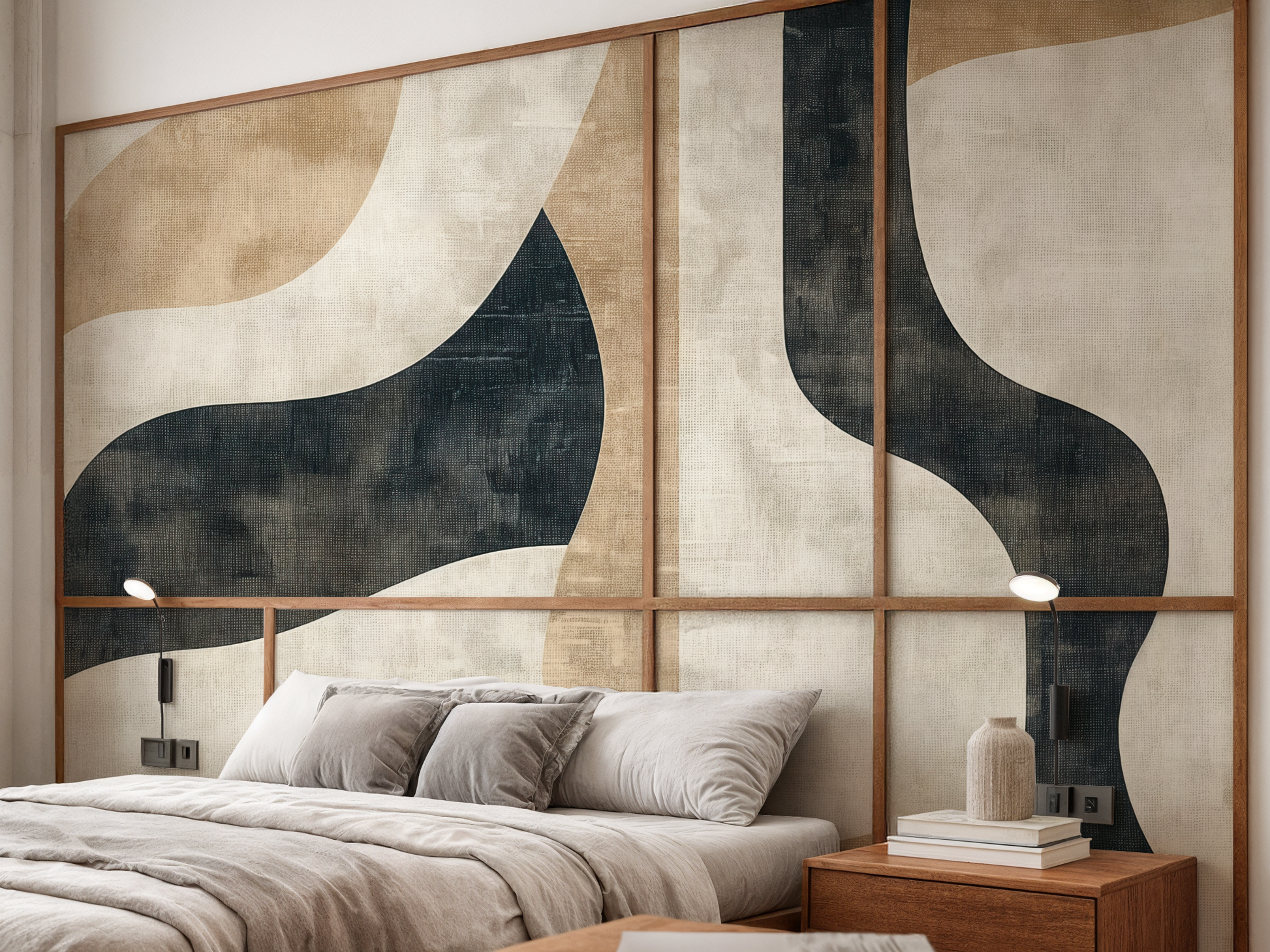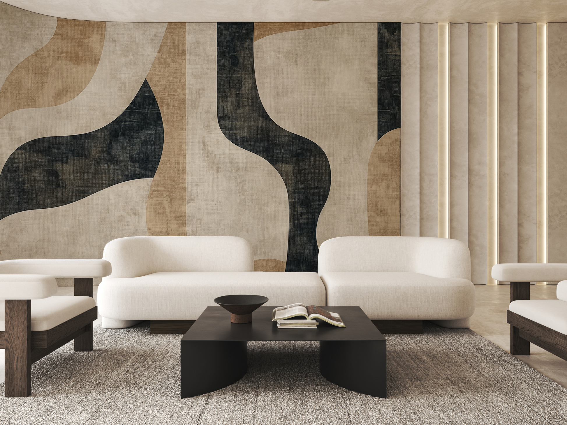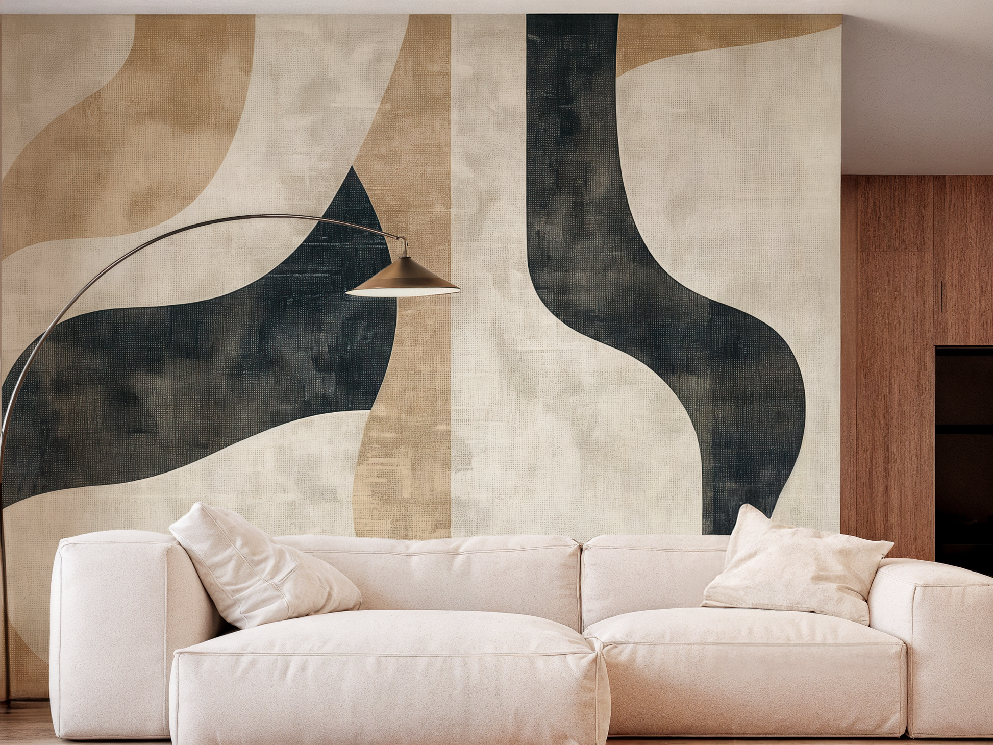 Inspired by the quiet journey of balance—between structure and softness, movement and pause—this Japandi wallpaper blends flowing forms with grounding shapes. A calm composition that invites mindful living. A space to follow. A space to be.