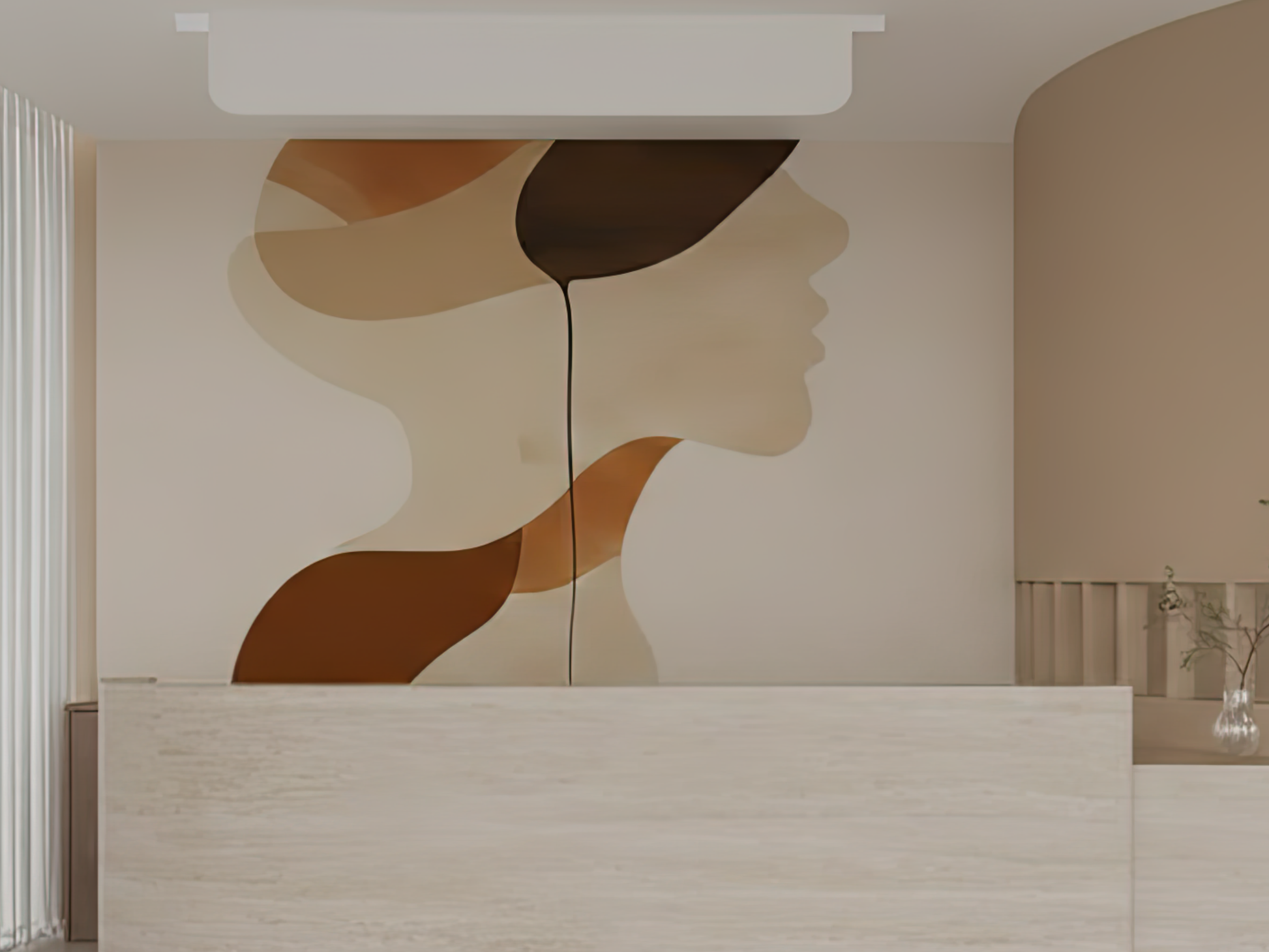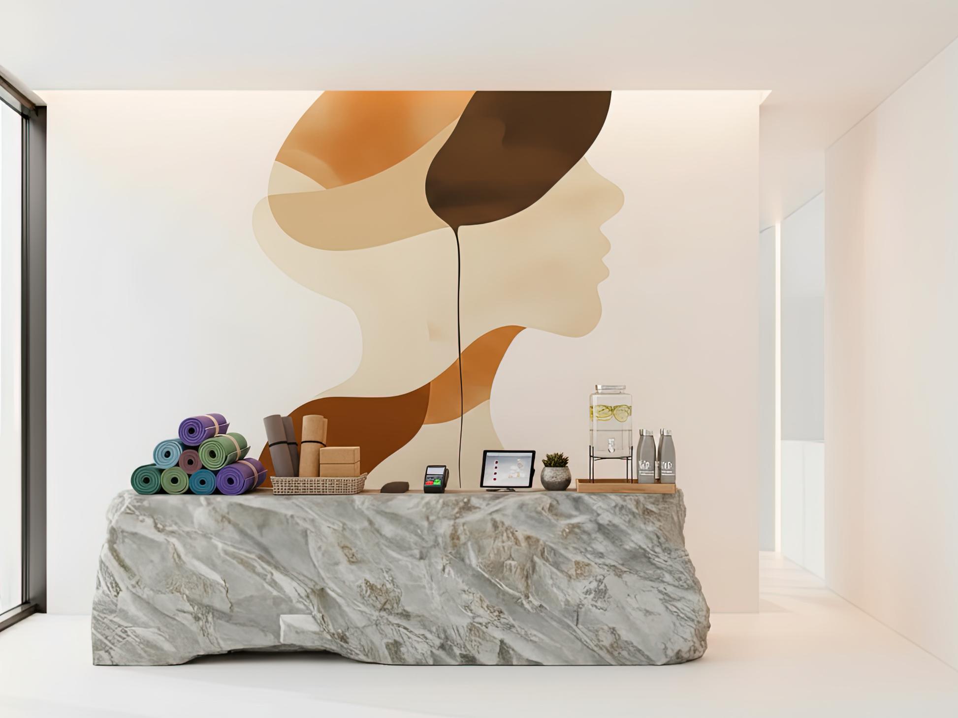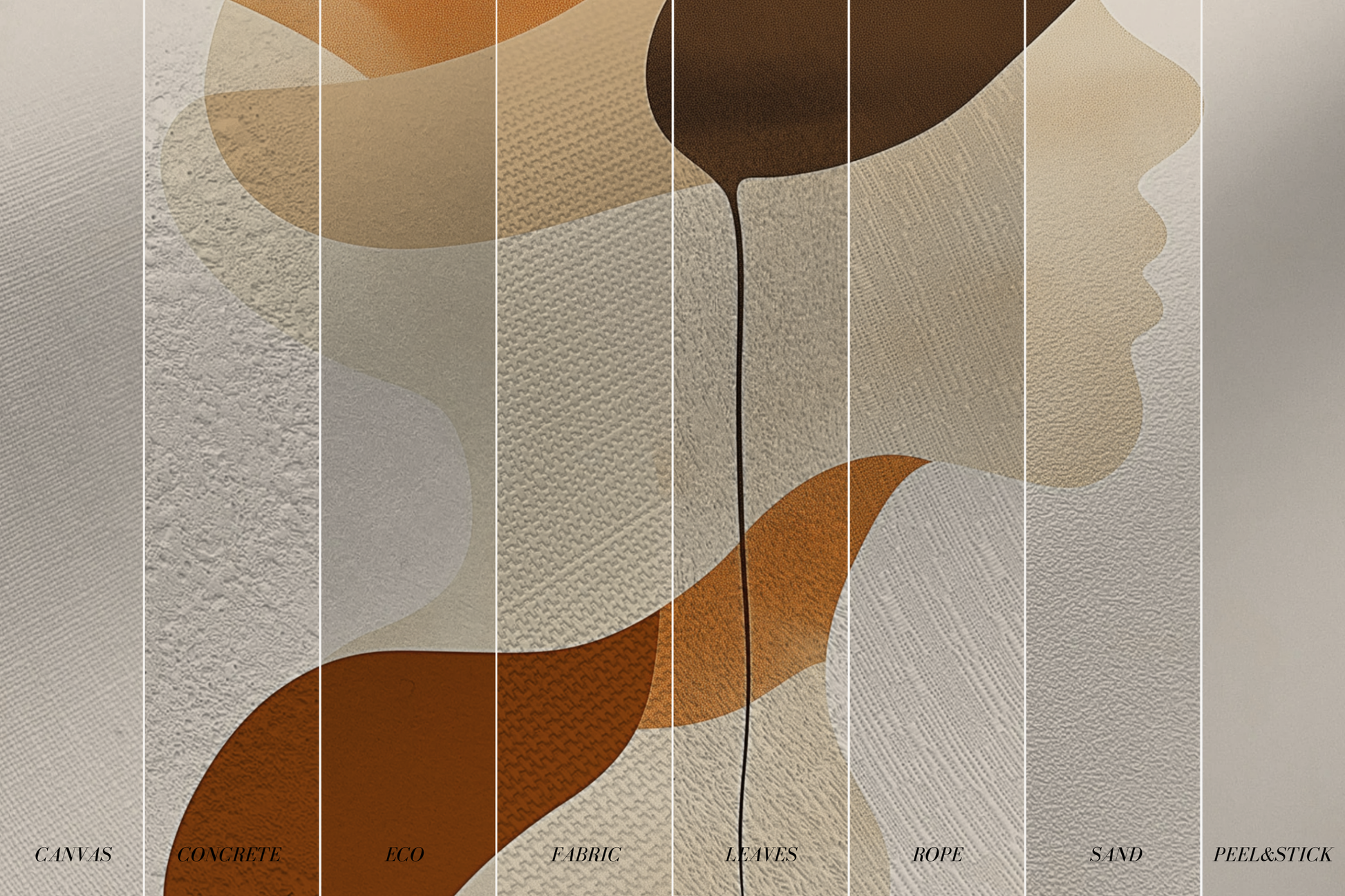 Inspired by the flowing elegance of feminine strength and the serenity of still profiles, this Japandi wallpaper layers soft curves with warm, earthen tones. A quiet portrait of balance, beauty, and calm presence. A space to honour. A space to be.