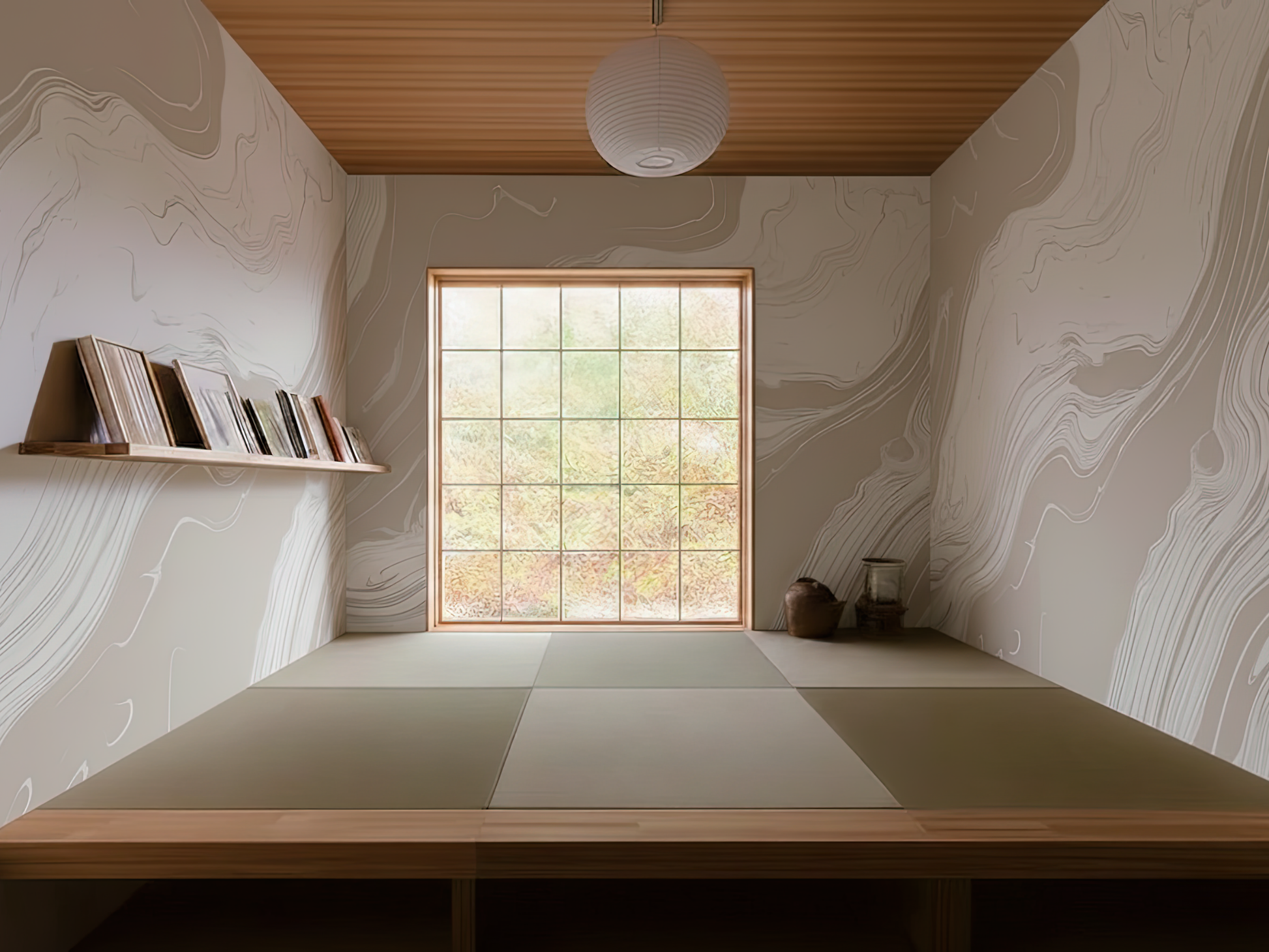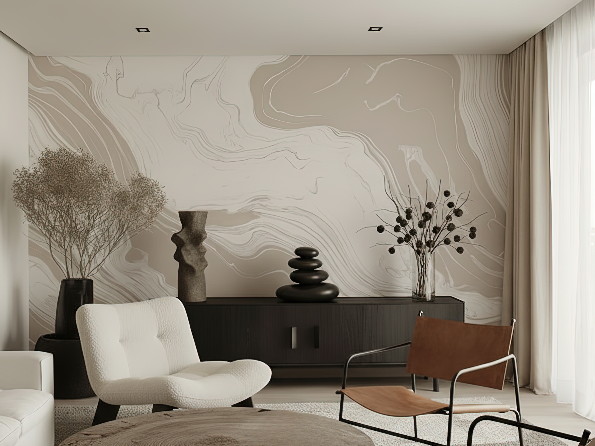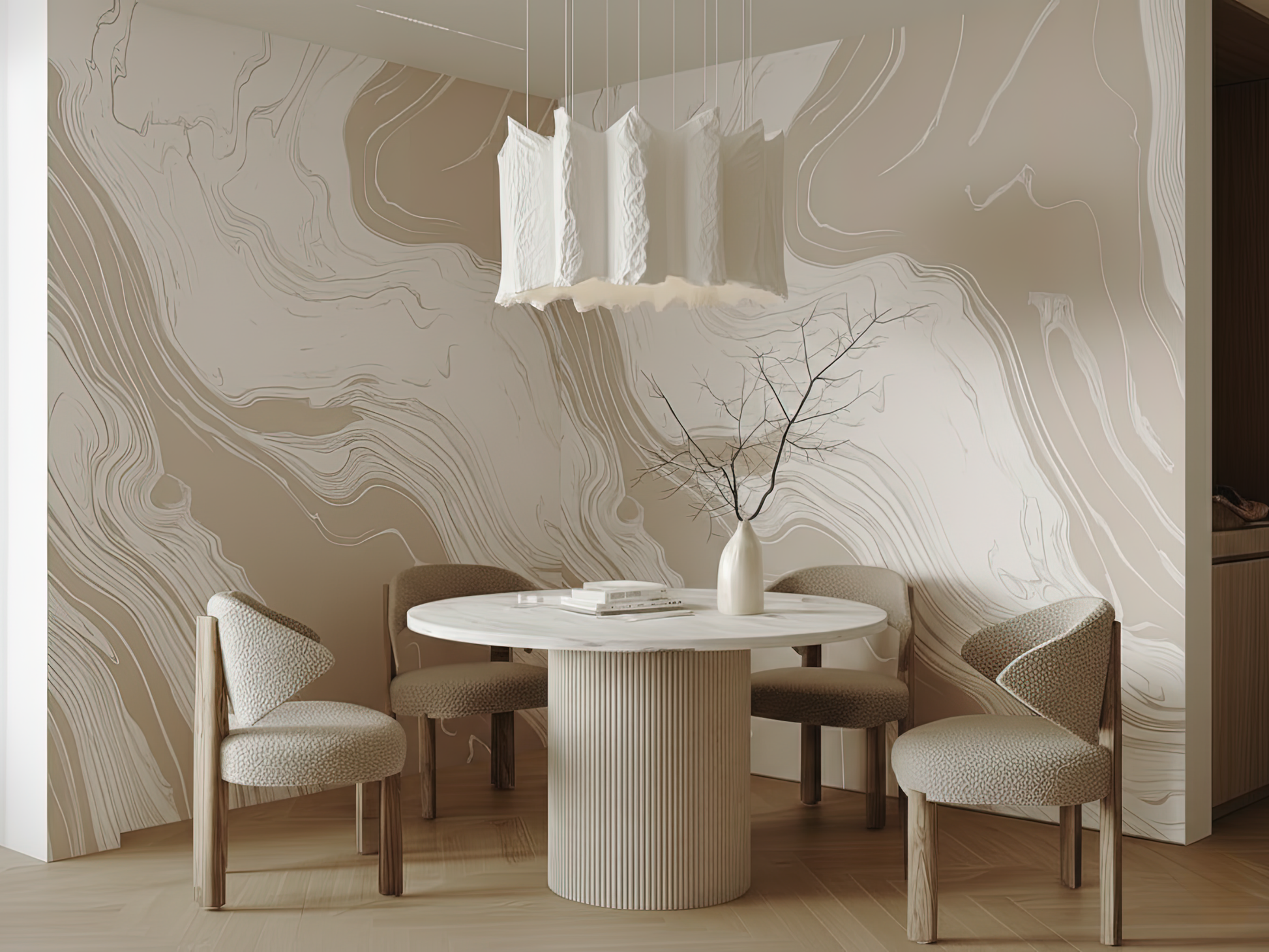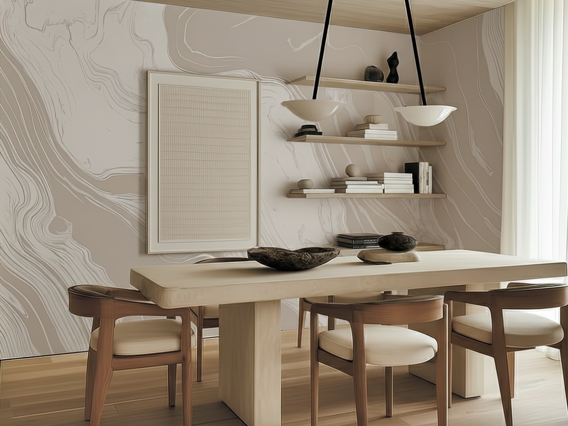 Inspired by the organic movement of tides meeting stone, this Japandi wallpaper captures the softness of water-carved marble. Each delicate swirl reflects nature’s quiet strength—fluid, calm, and grounded. A space to breathe, a space to be.