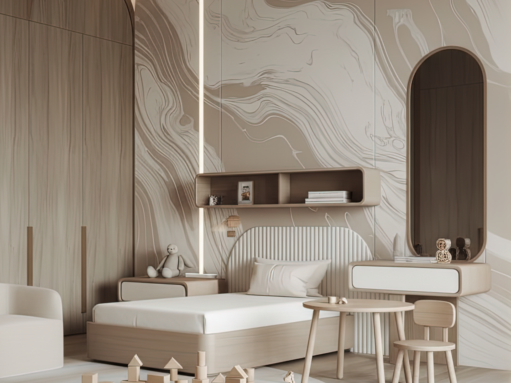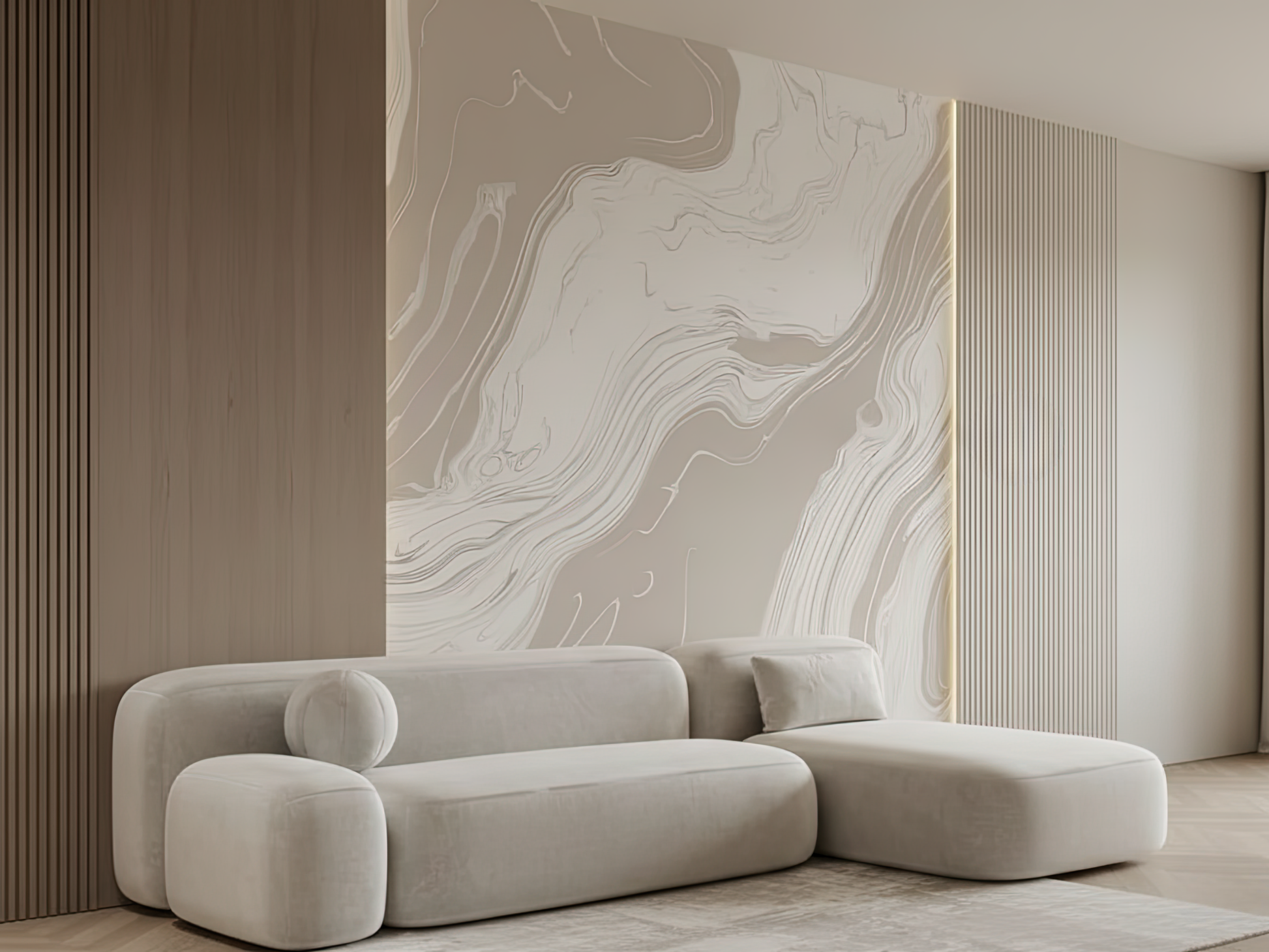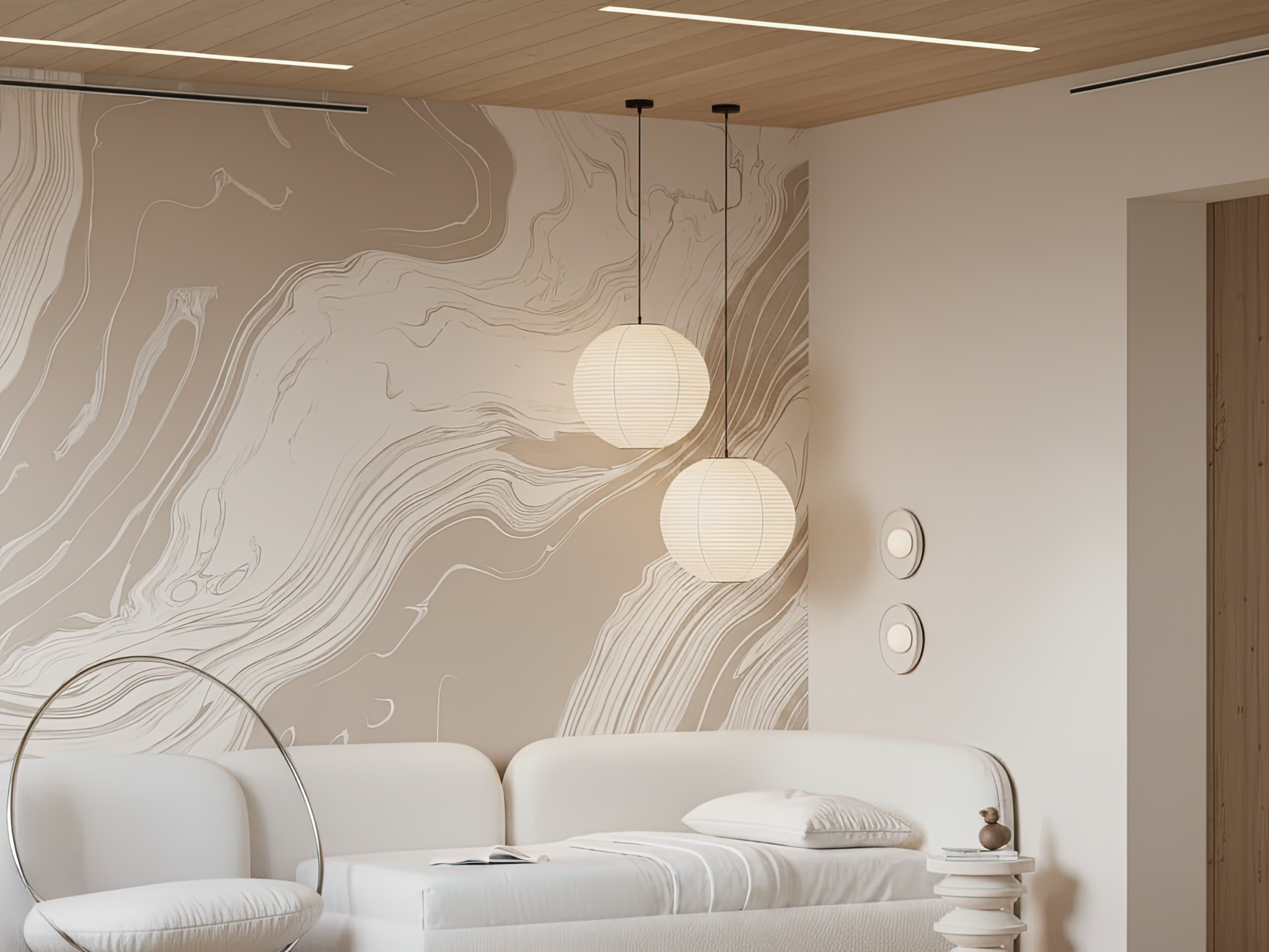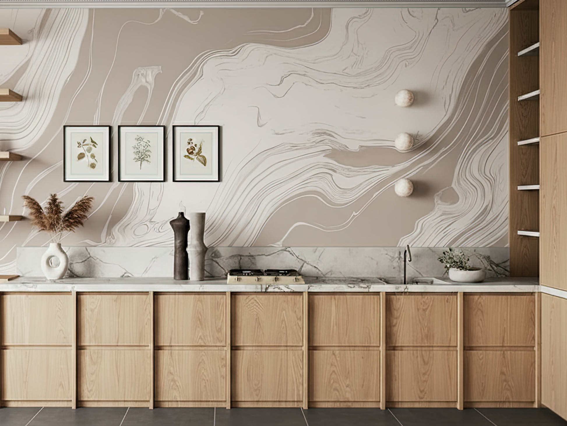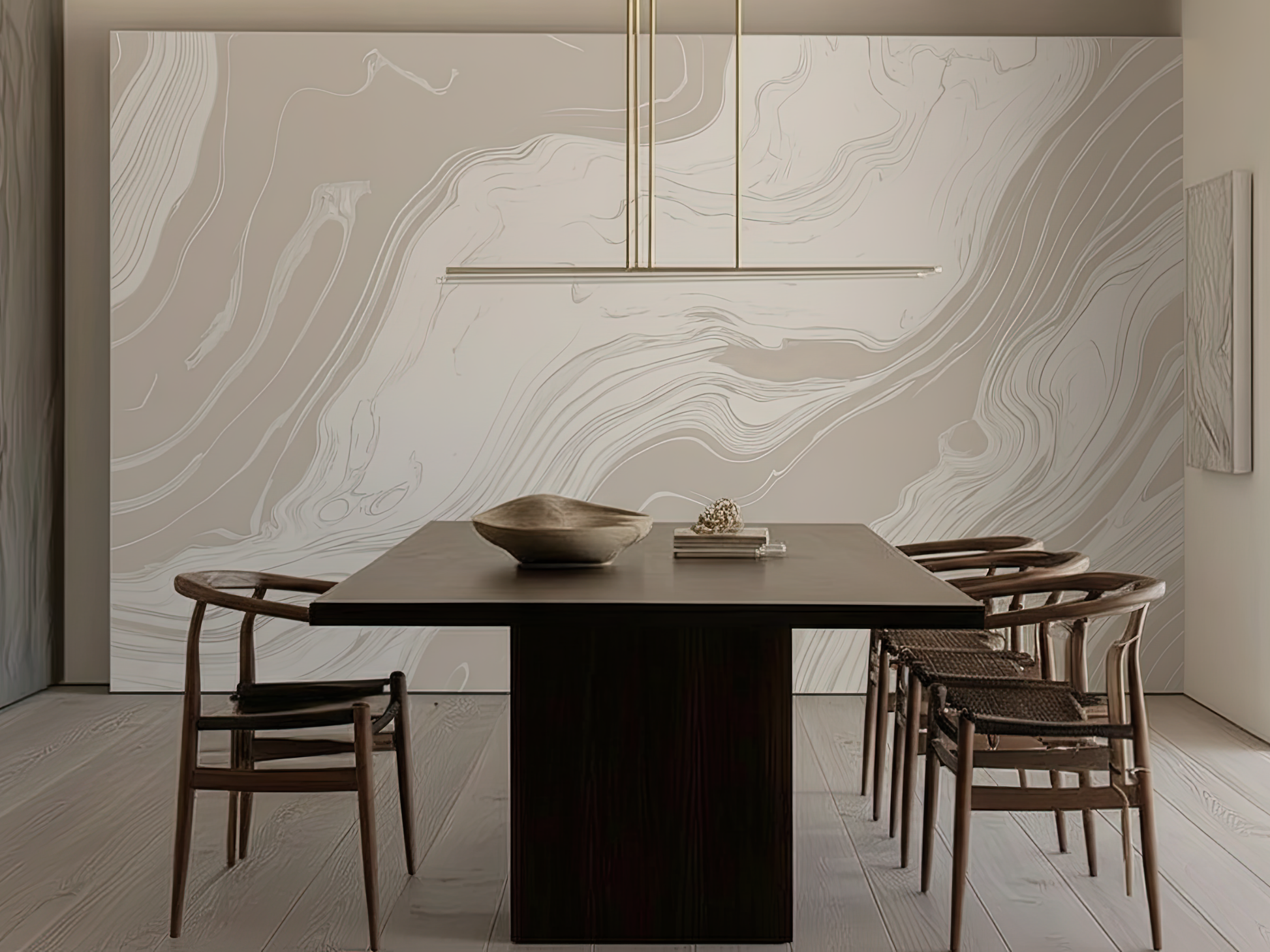 Inspired by the organic movement of tides meeting stone, this Japandi wallpaper captures the softness of water-carved marble. Each delicate swirl reflects nature’s quiet strength—fluid, calm, and grounded. A space to breathe, a space to be.