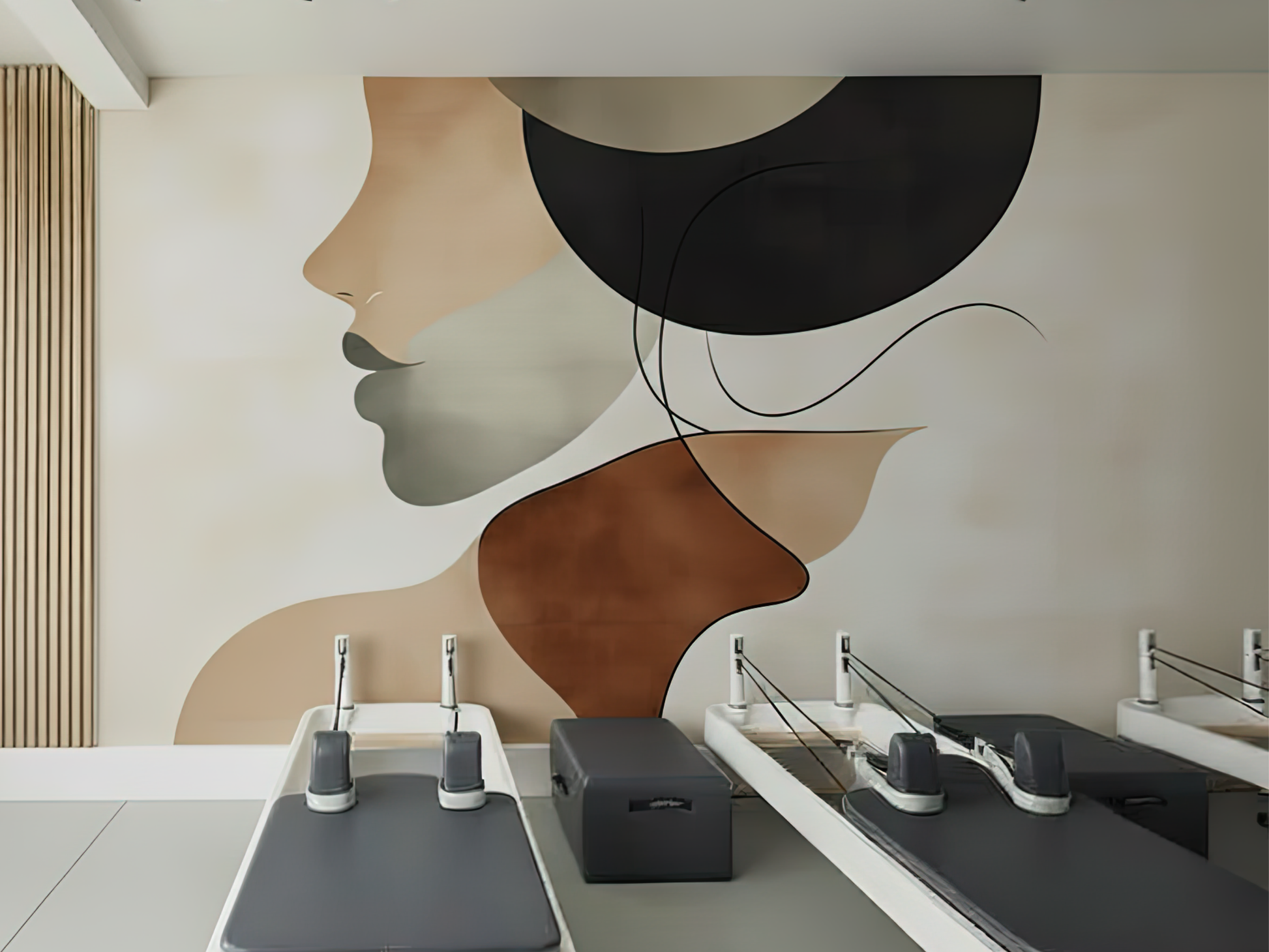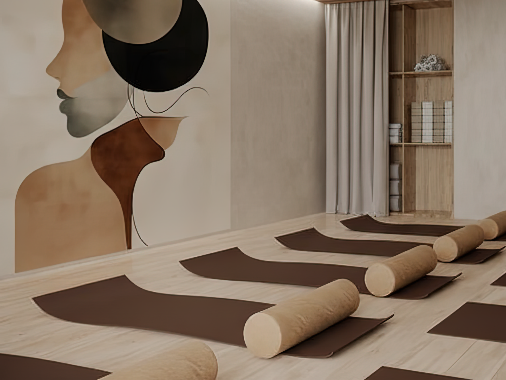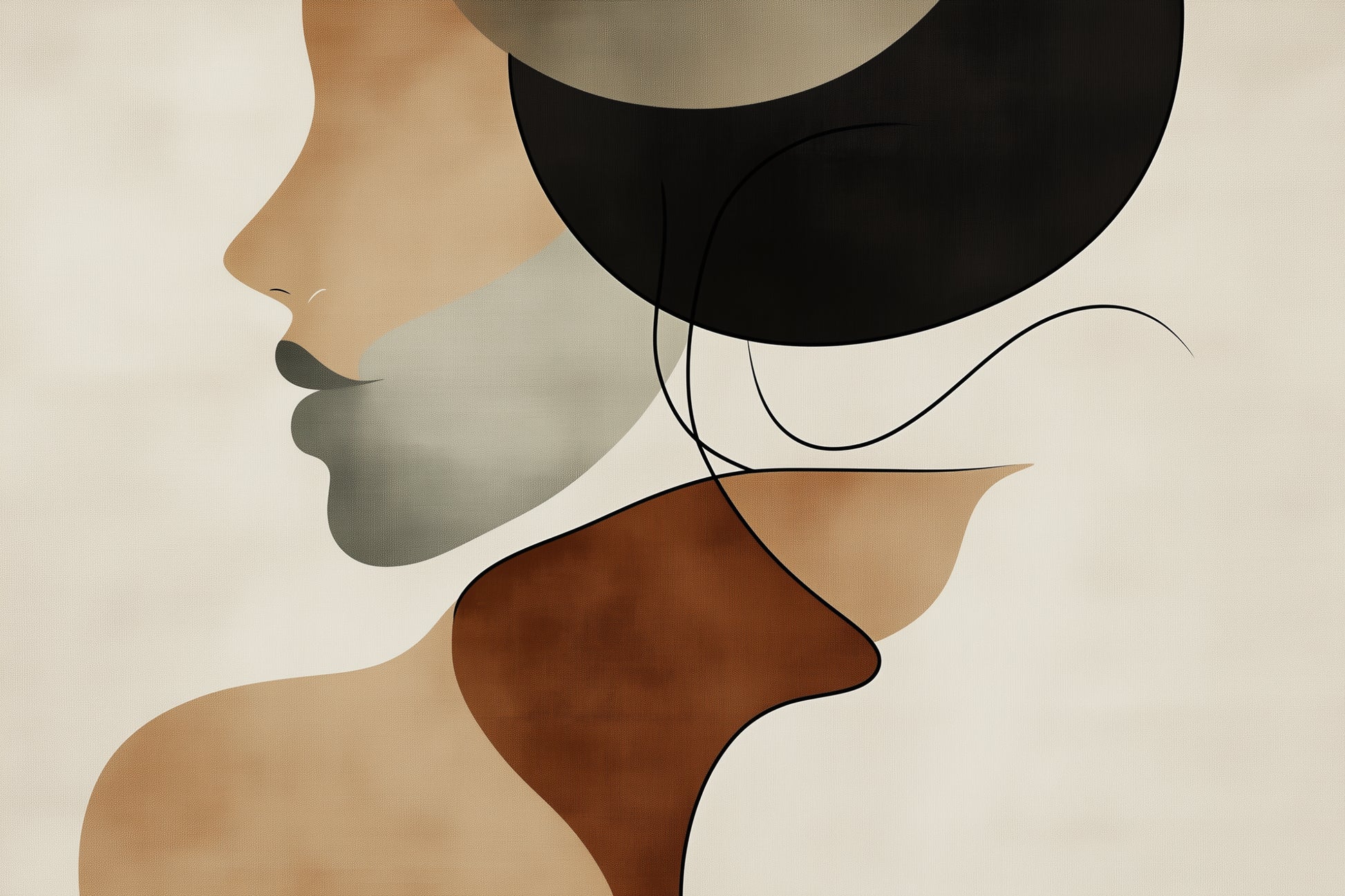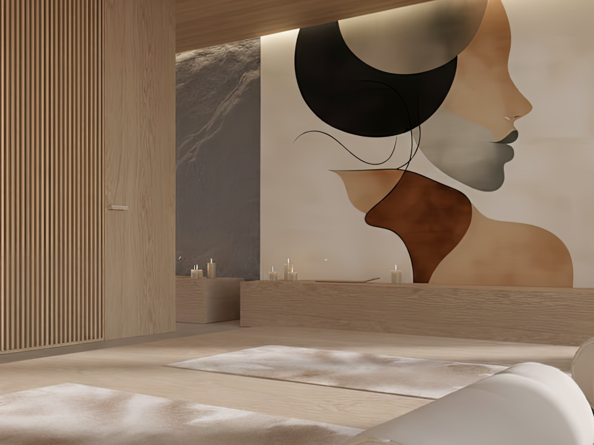 Soft curves and layered tones of terracotta, beige, and charcoal flow together to form an abstract silhouette, evoking both strength and tenderness. The design captures the warmth of human presence, as if illuminated from within, a glow that is calm, timeless, and deeply grounding. It is a mural of balance and serenity, offering a gentle reminder that beauty lives not in excess, but in the harmony of form and feeling.