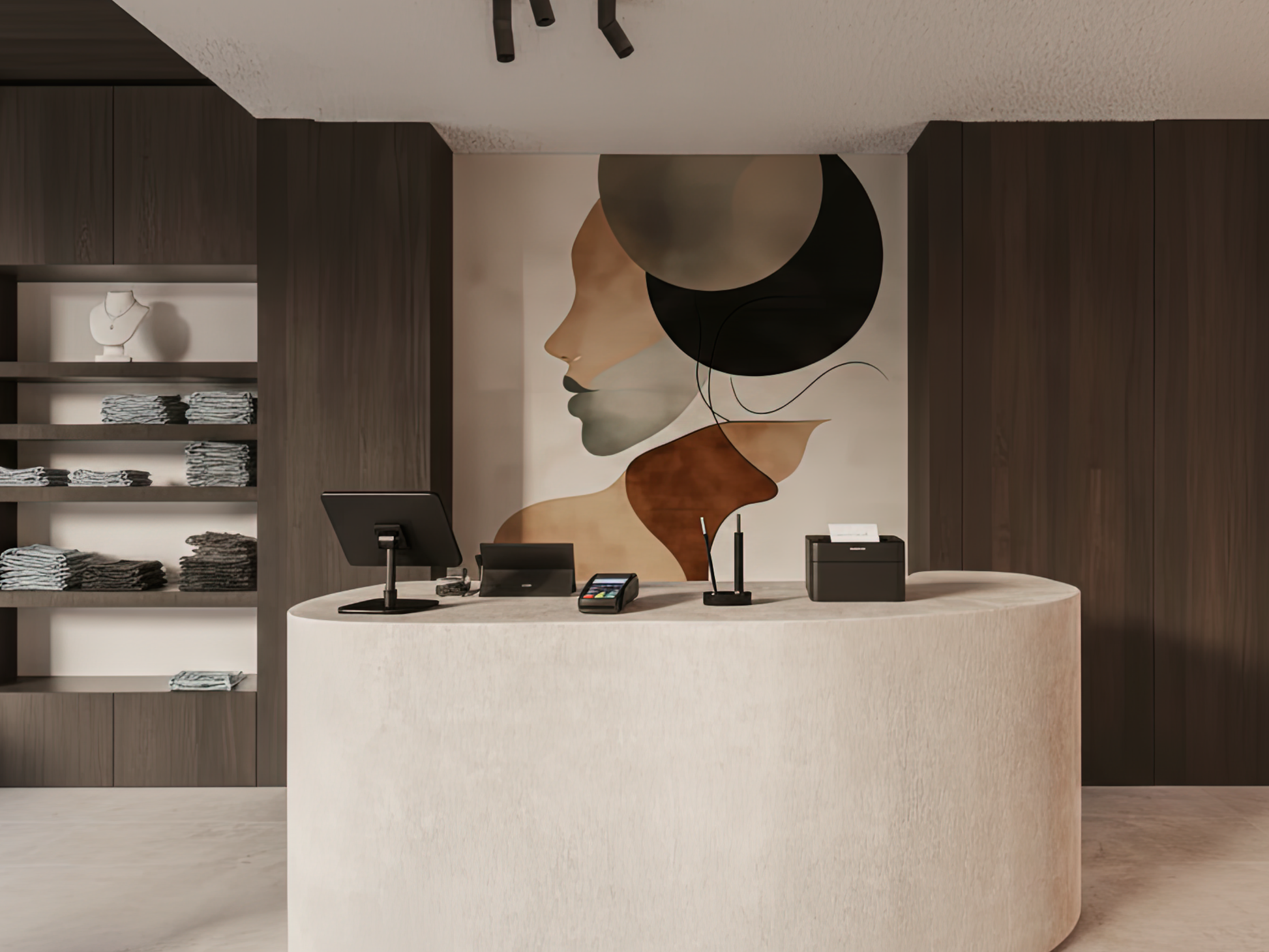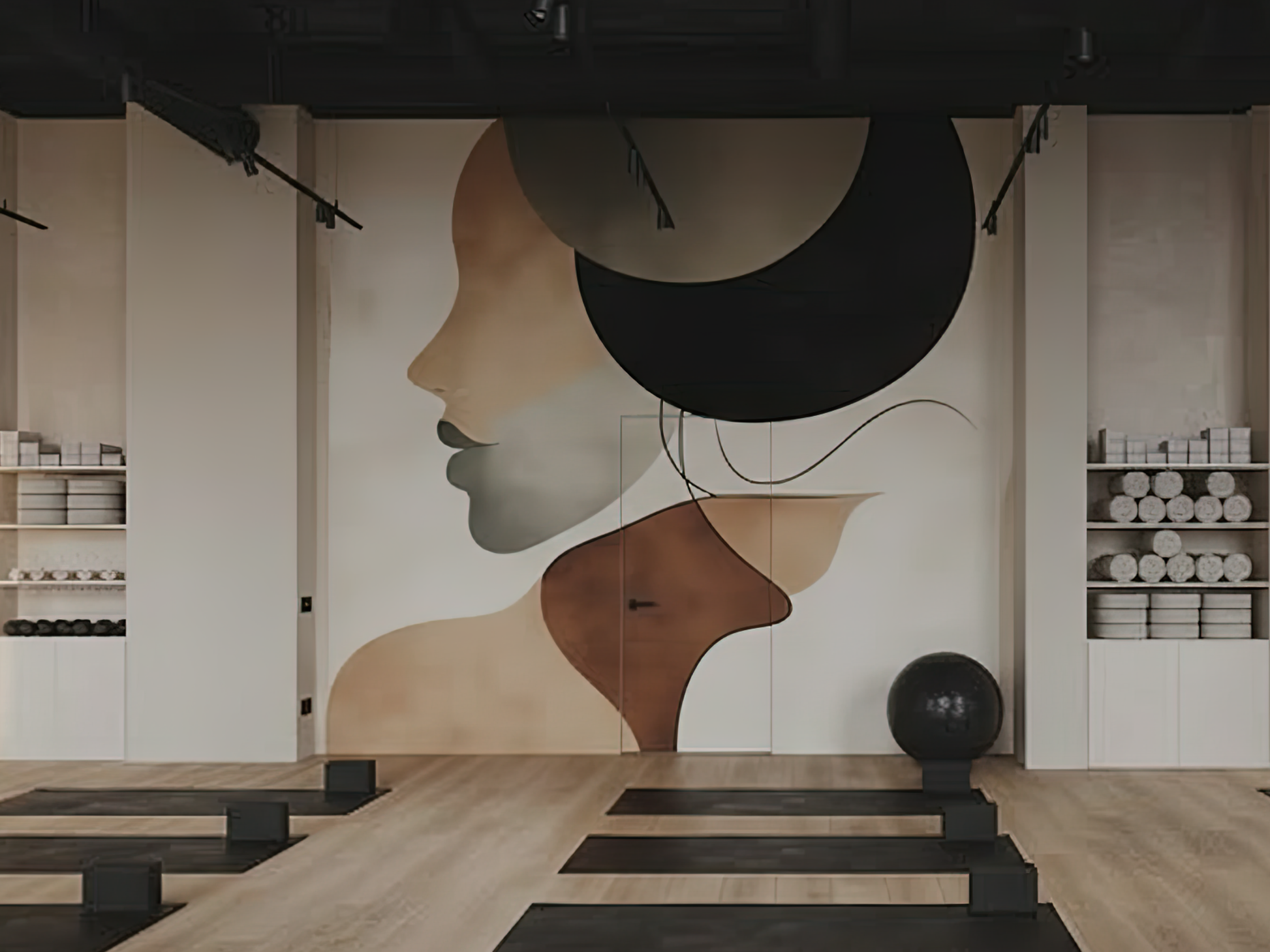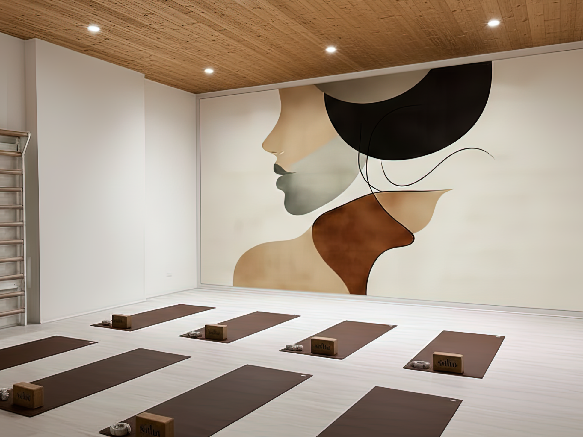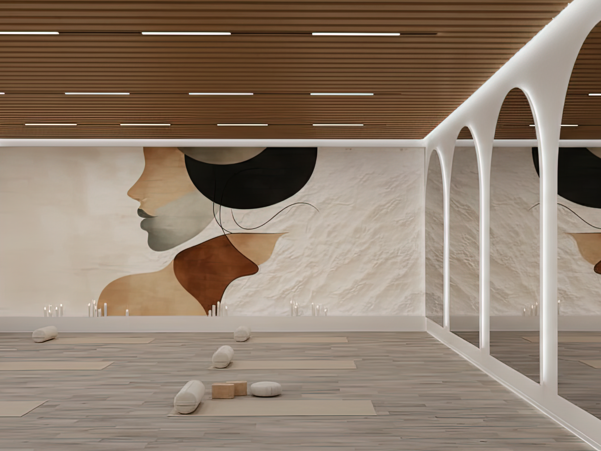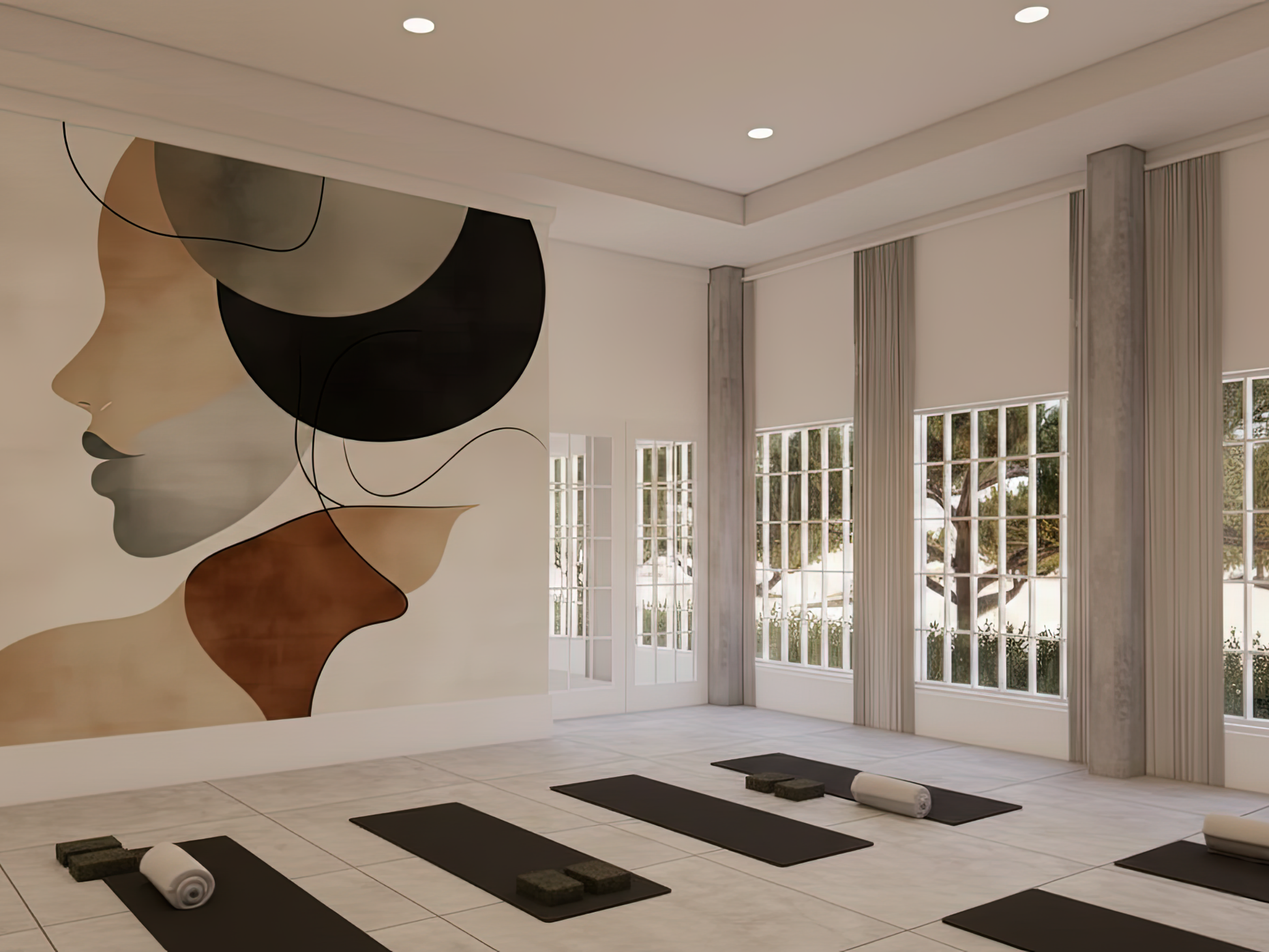Soft curves and layered tones of terracotta, beige, and charcoal flow together to form an abstract silhouette, evoking both strength and tenderness. The design captures the warmth of human presence, as if illuminated from within, a glow that is calm, timeless, and deeply grounding. It is a mural of balance and serenity, offering a gentle reminder that beauty lives not in excess, but in the harmony of form and feeling.