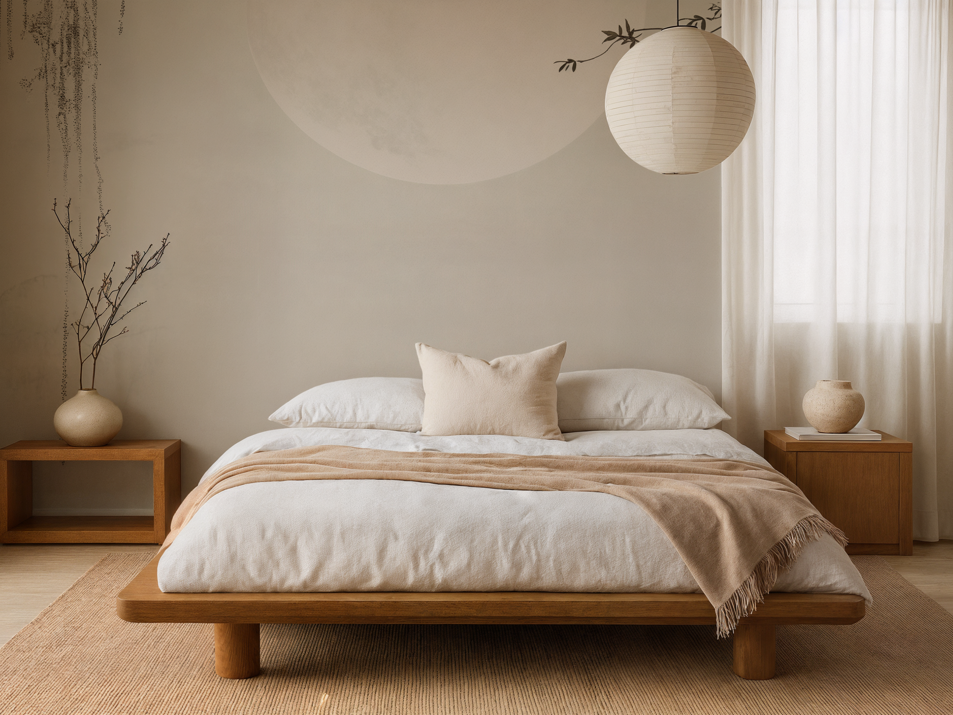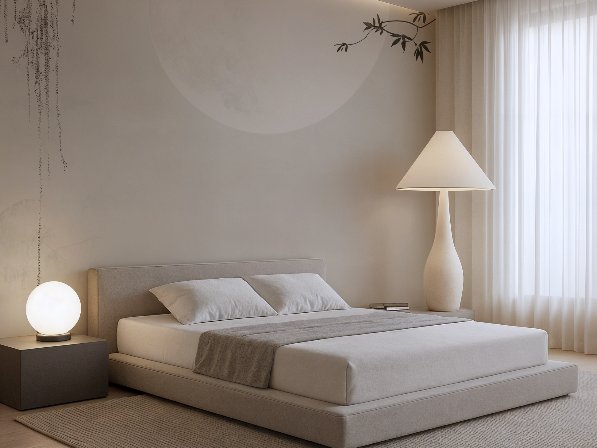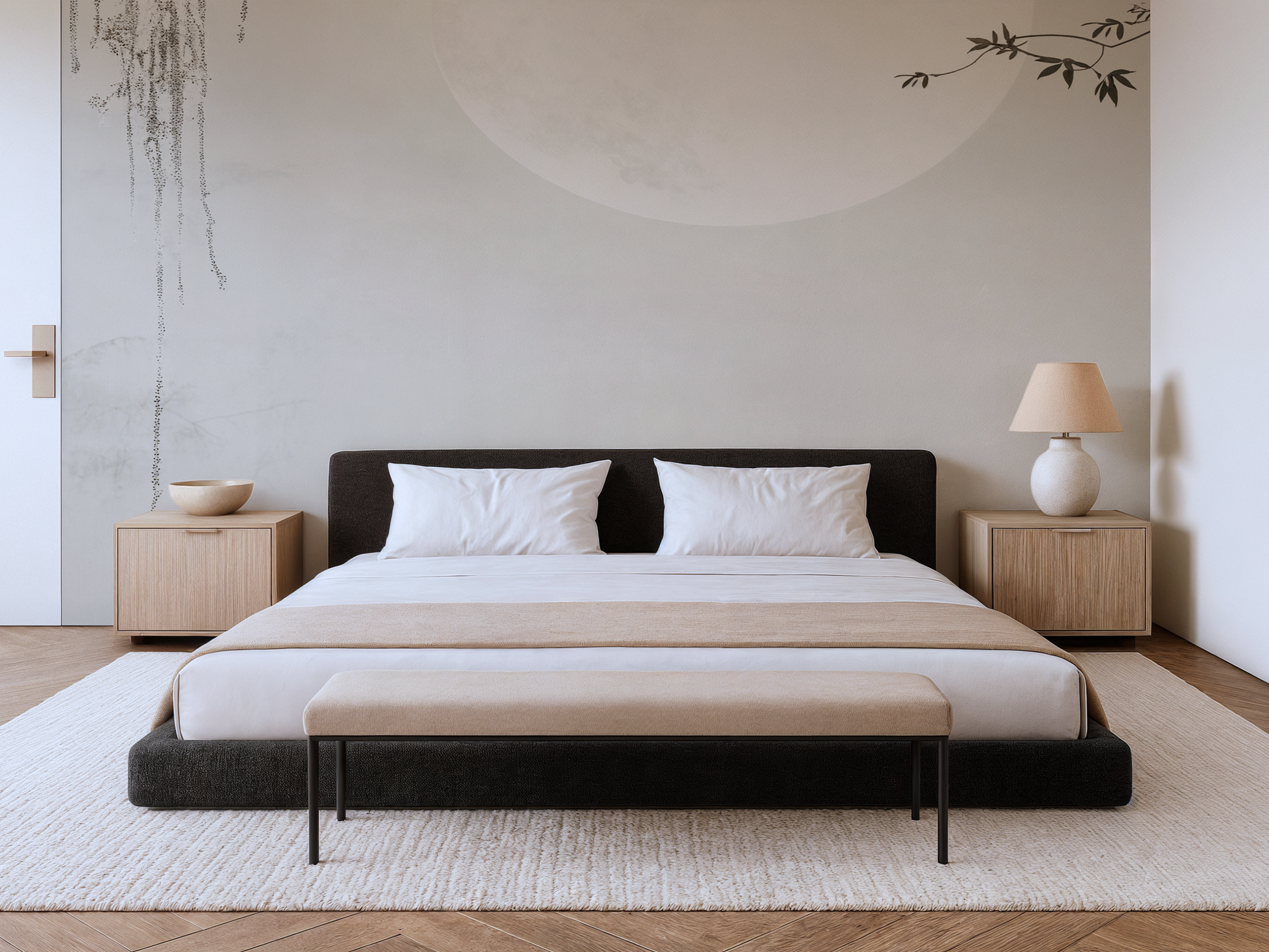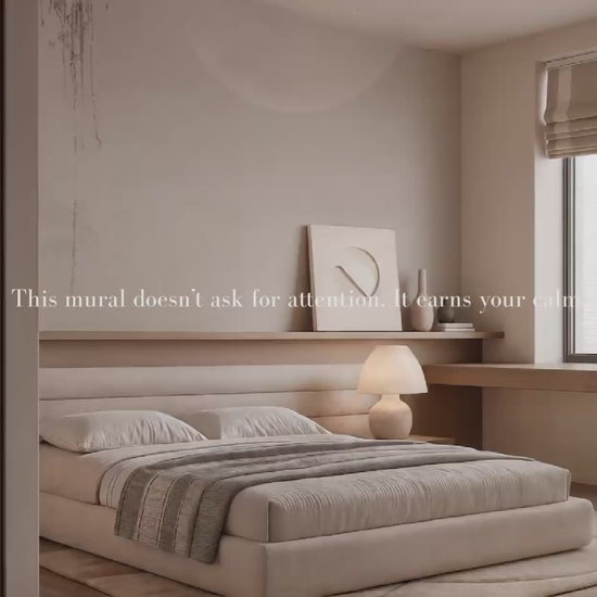 Inspired by the stillness of midnight skies and the soft glow of a full moon, this Japandi wallpaper evokes calm with its minimal composition and ethereal light. A gentle pause in time. A space to dream. A space to simply be.