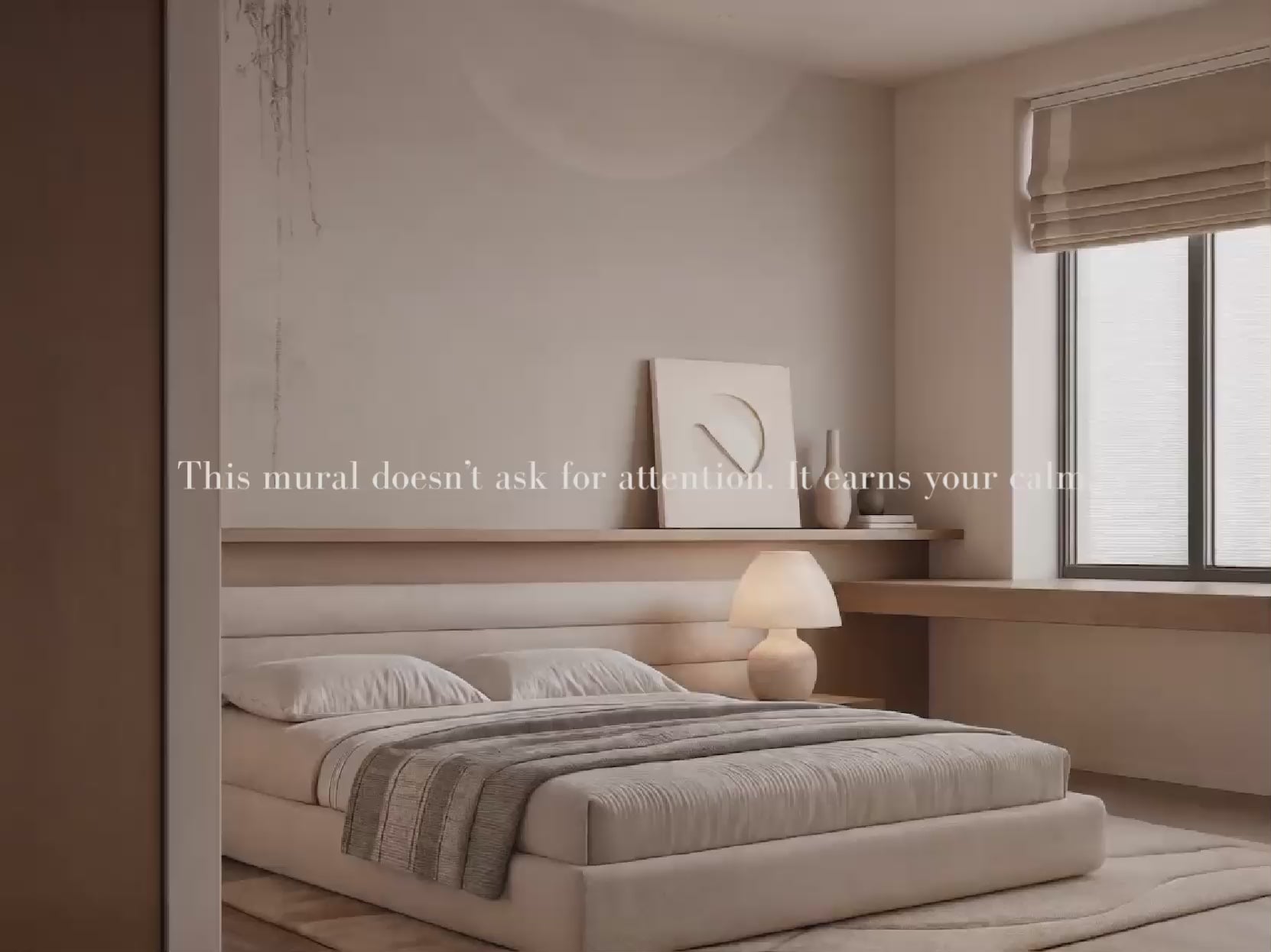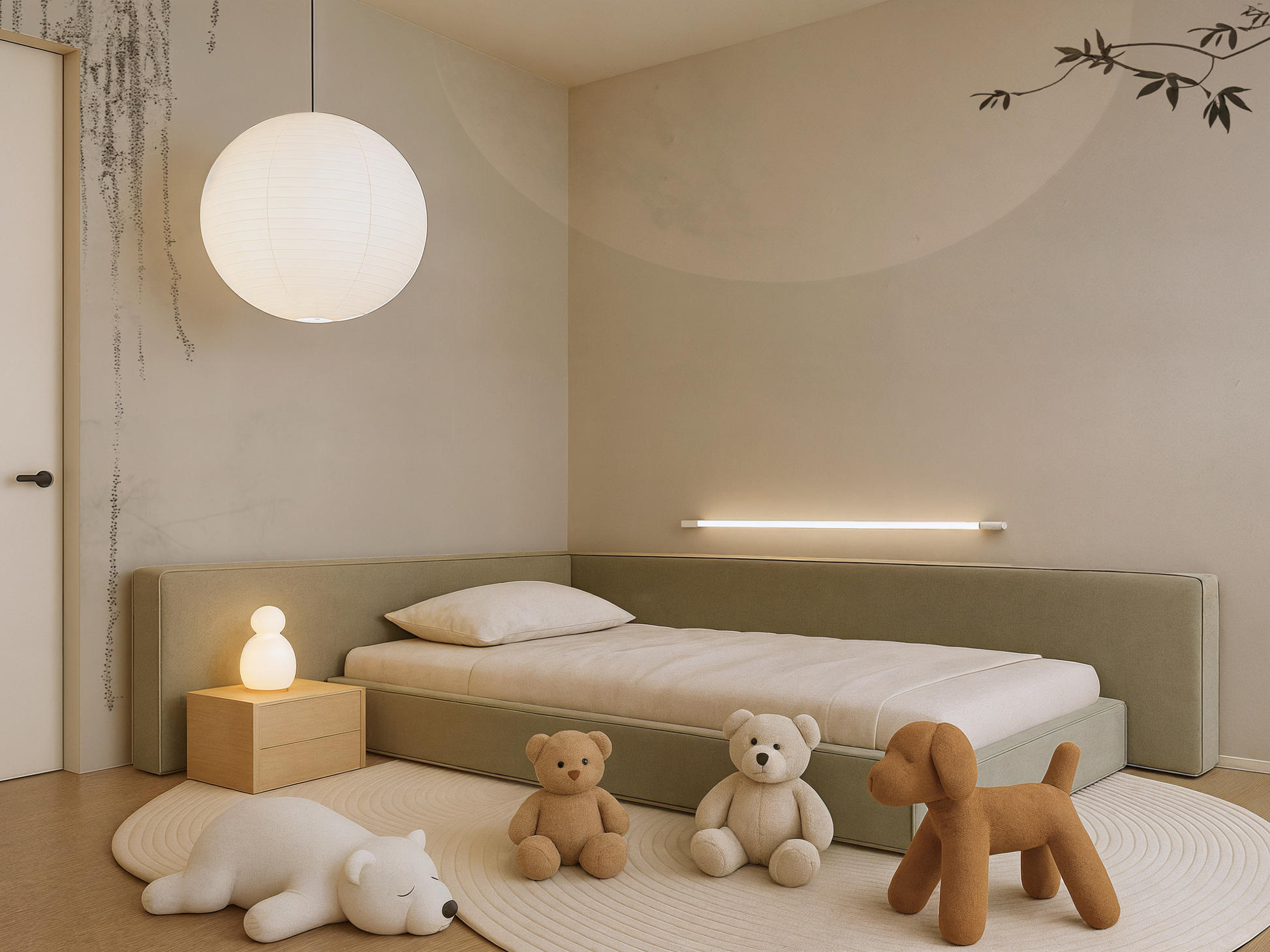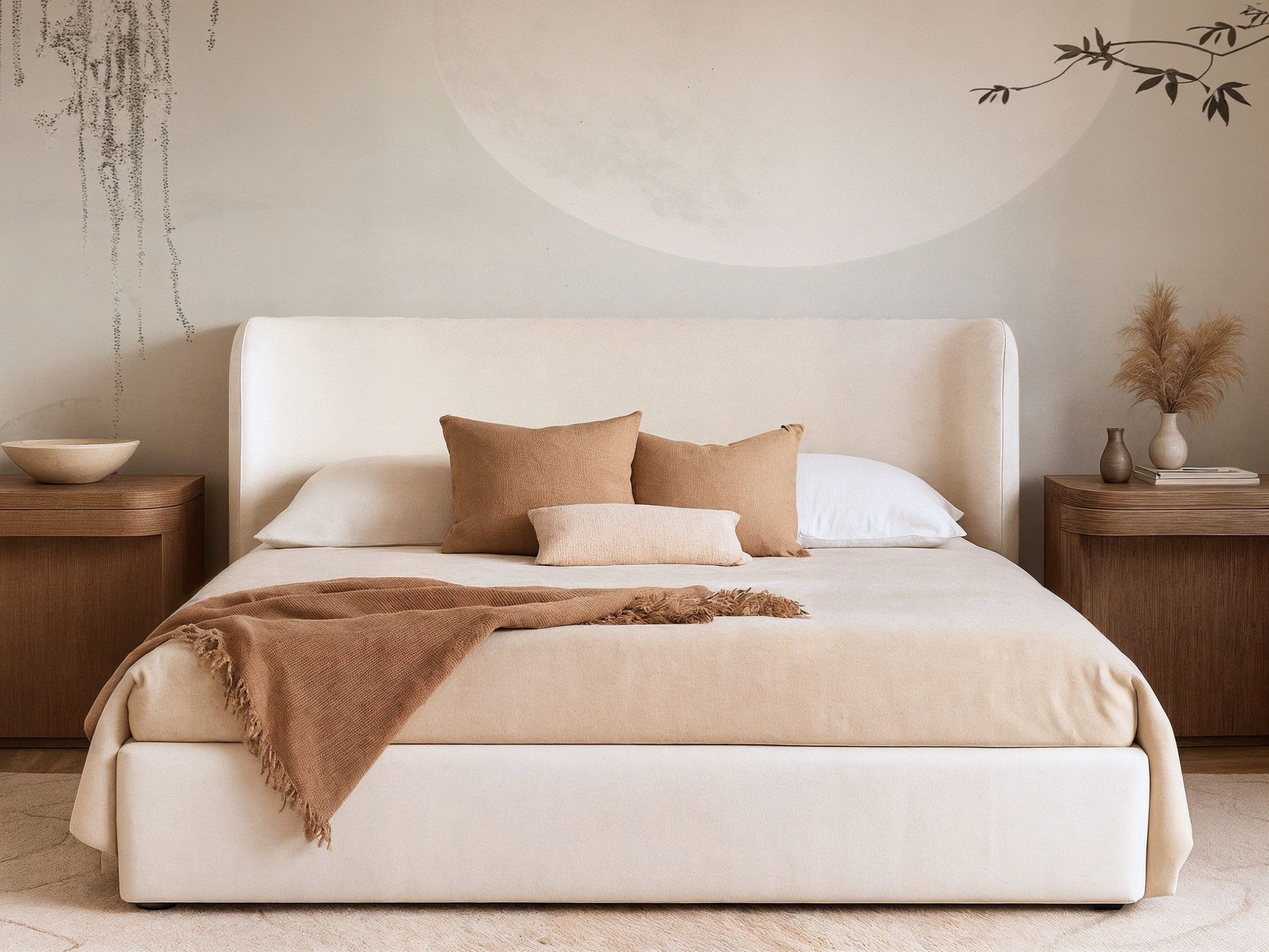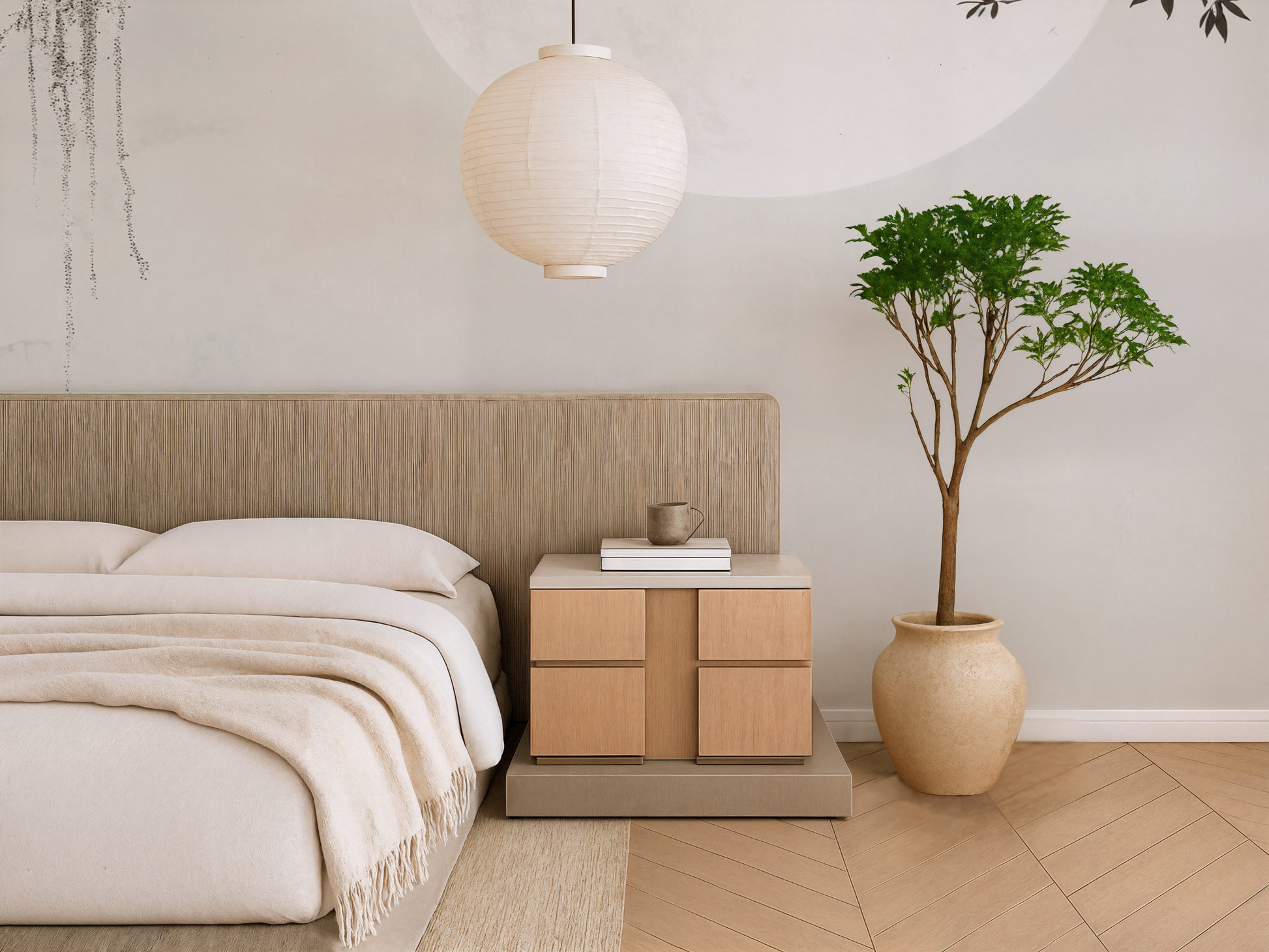 Inspired by the stillness of midnight skies and the soft glow of a full moon, this Japandi wallpaper evokes calm with its minimal composition and ethereal light. A gentle pause in time. A space to dream. A space to simply be.
