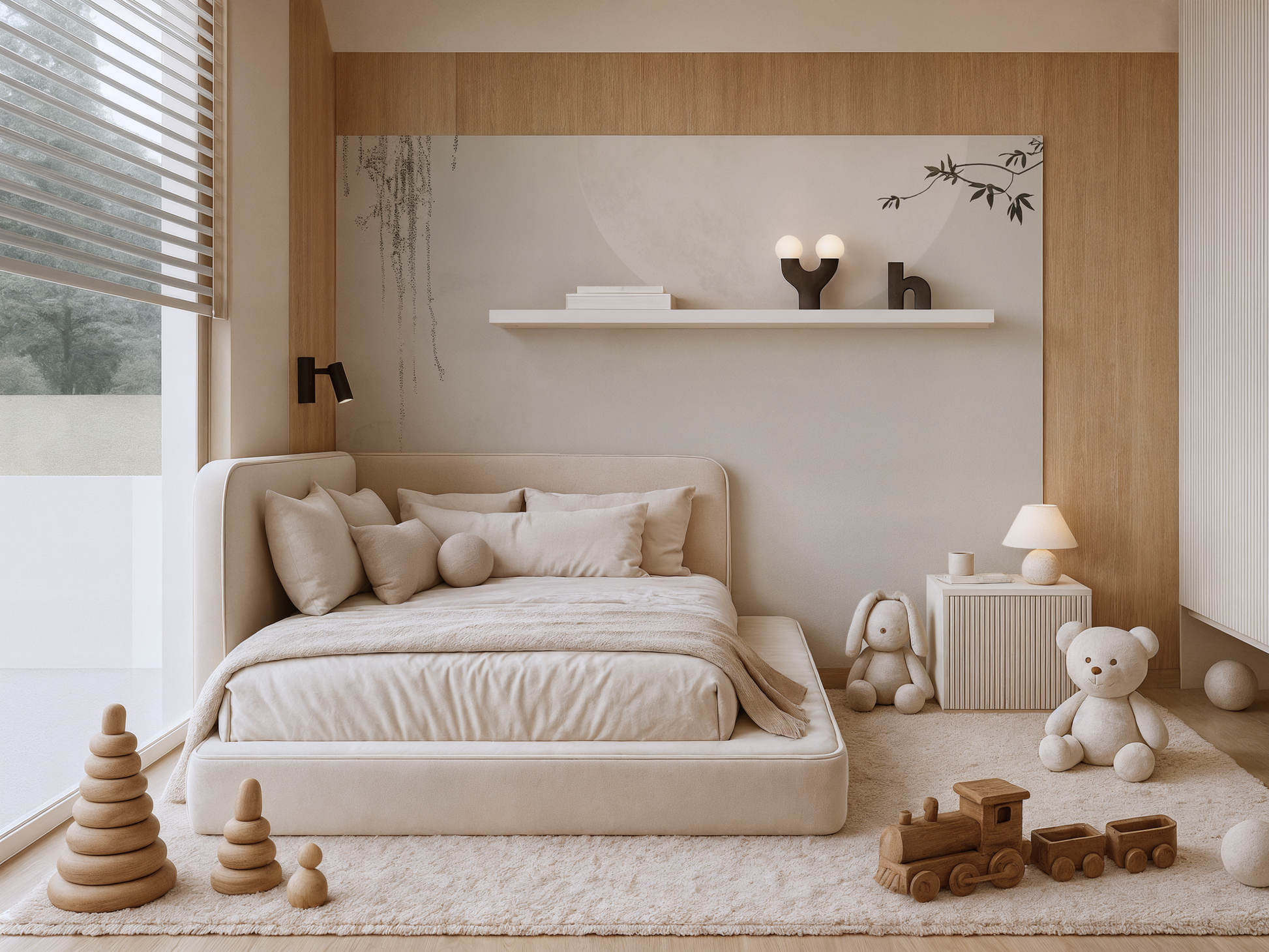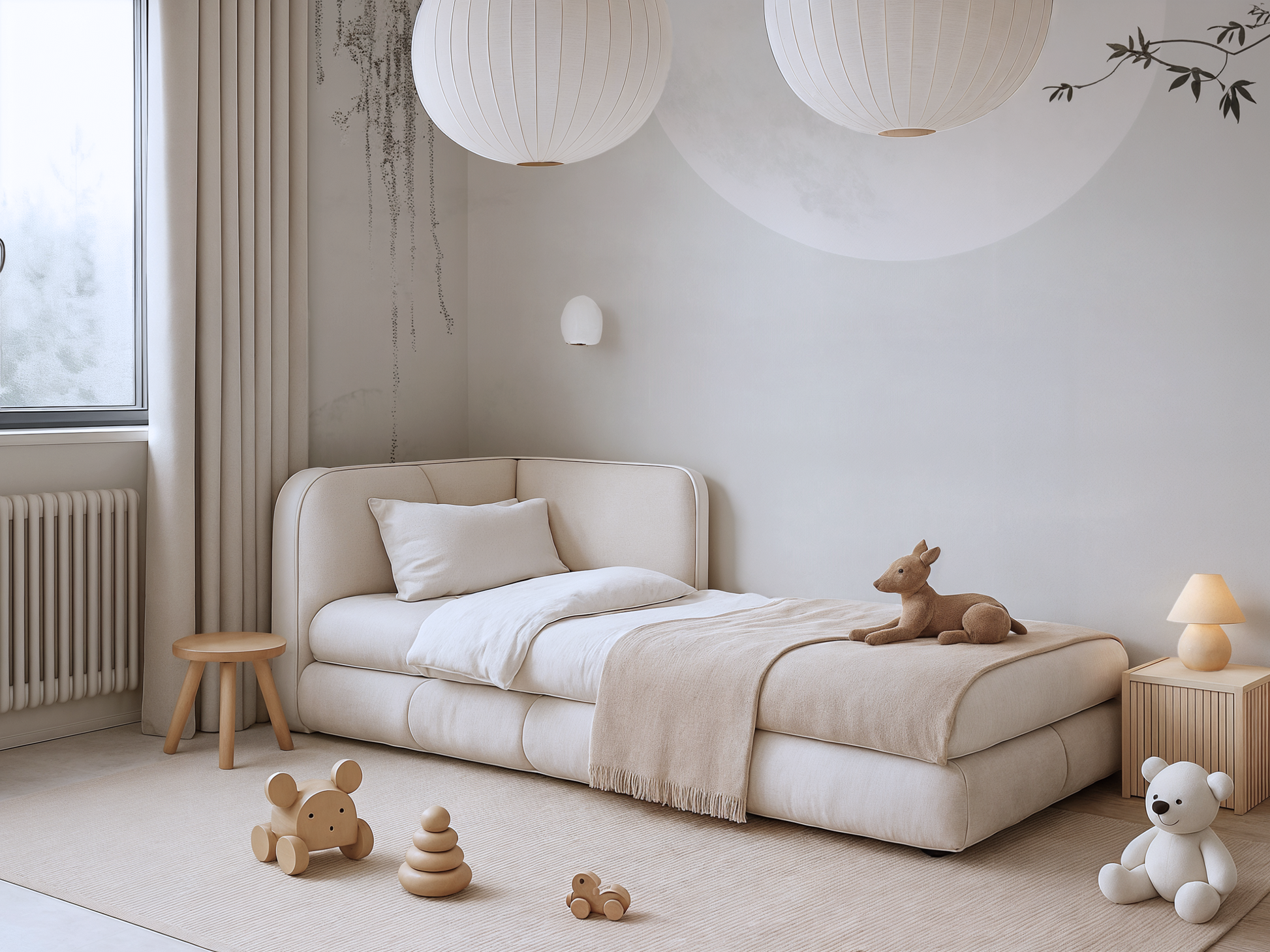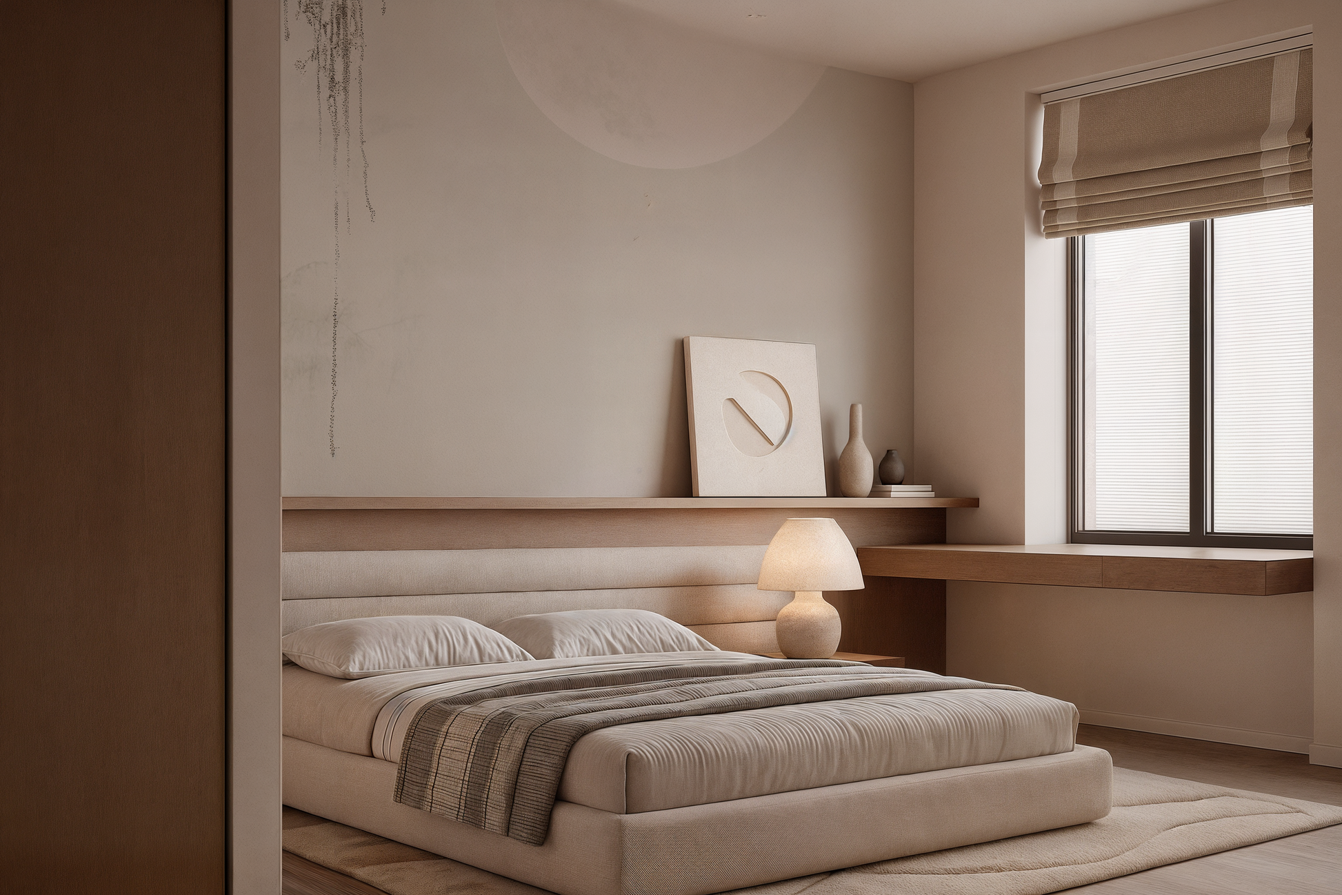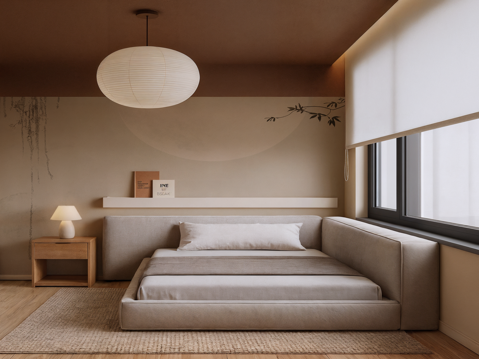Inspired by the stillness of midnight skies and the soft glow of a full moon, this Japandi wallpaper evokes calm with its minimal composition and ethereal light. A gentle pause in time. A space to dream. A space to simply be.